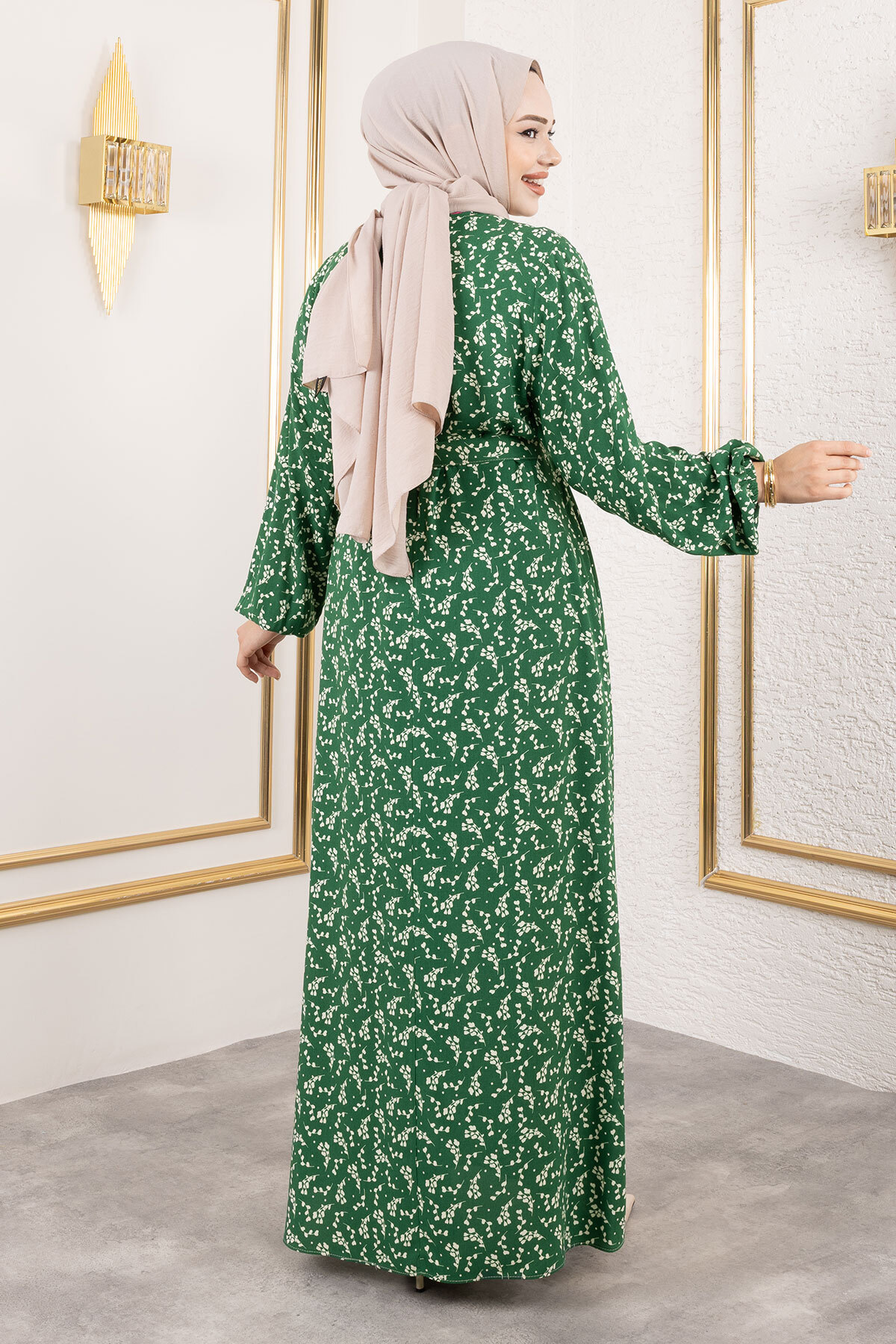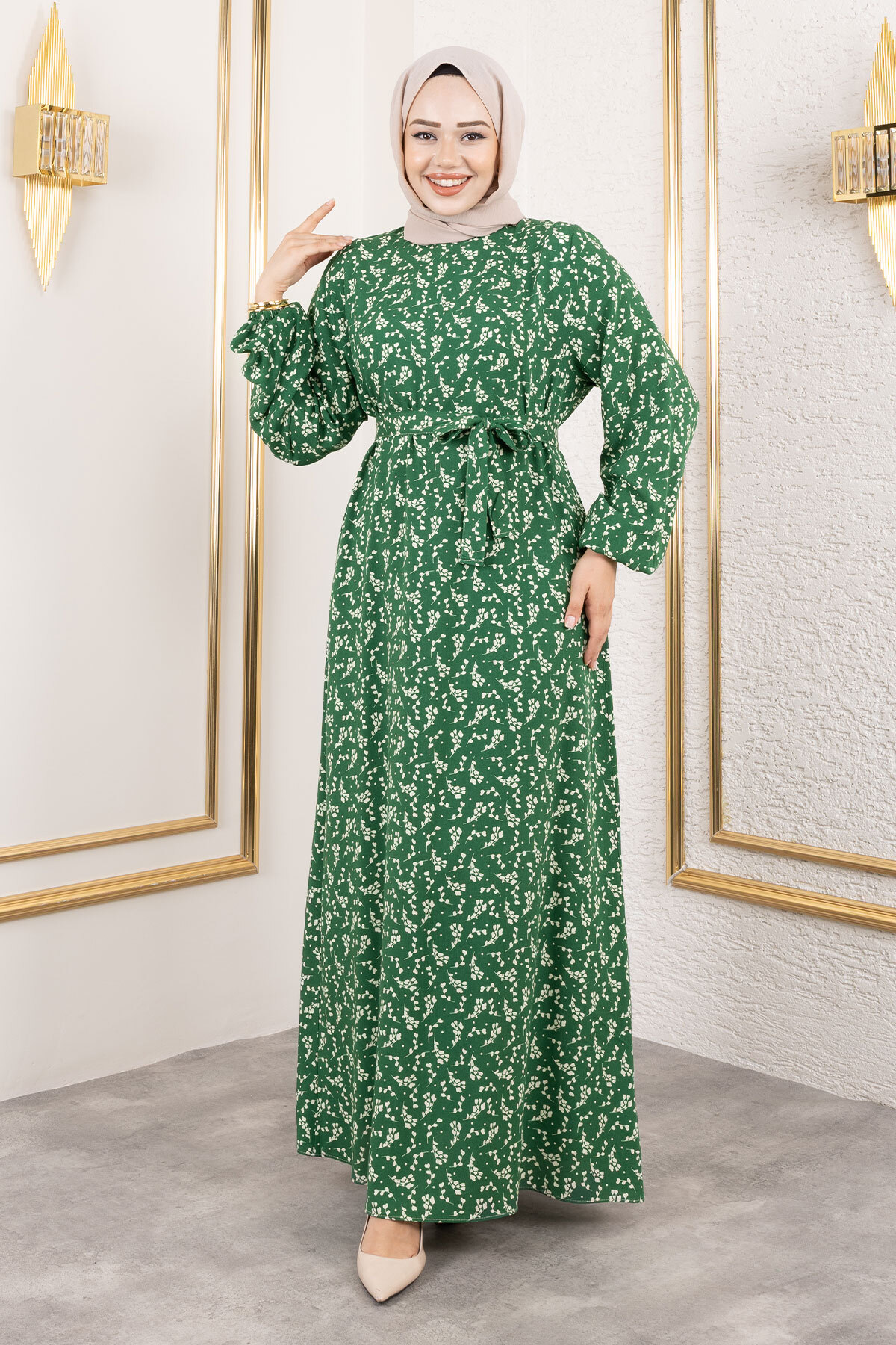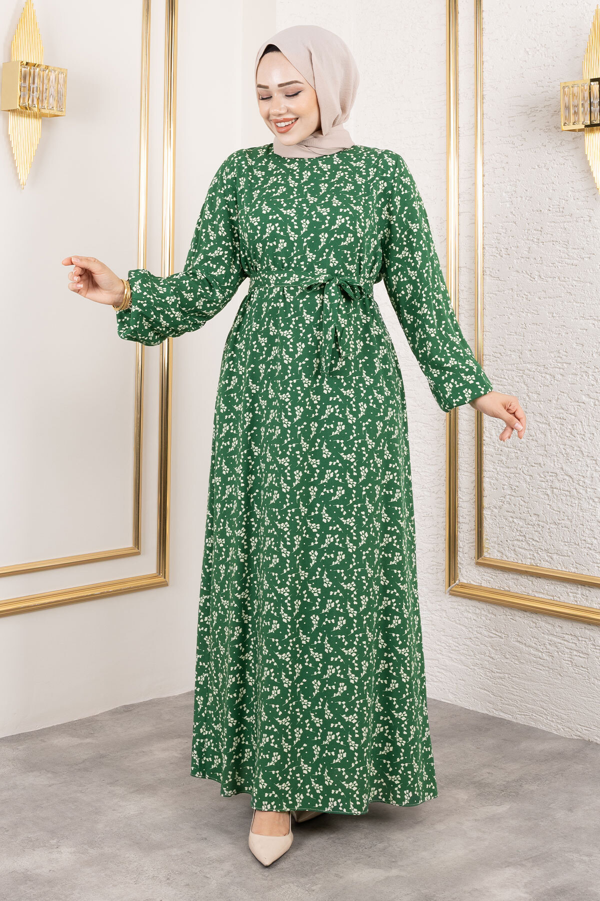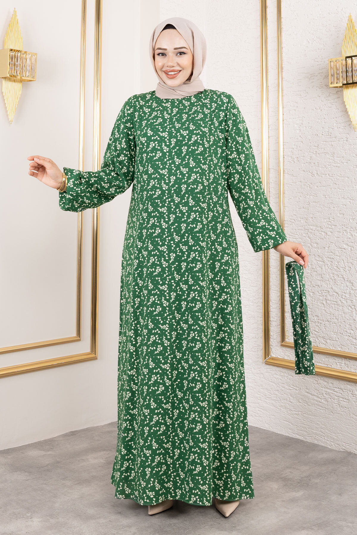 Küçük Çiçek Desenli Viskon Elbise TSD250215 Yeşil