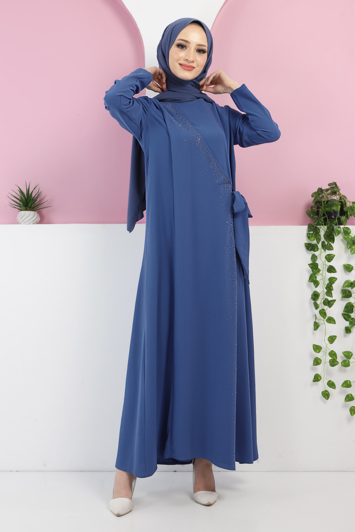 Kumaş Özelliği : Örme dabıl kumaştan üretilmiştir.Ürün Özelliği : Yeni sezon Önden Bağlamalı Elbise modelidir.Kuşağı sabittir, çıkarılamaz. Önden taşlıdır ve çapraz başlamalıdır. Astarsızdır. Arkadan fermuarlıdır. Ürün renginde konsept çekimlerinden dolayı ton farklılığı olabilir.