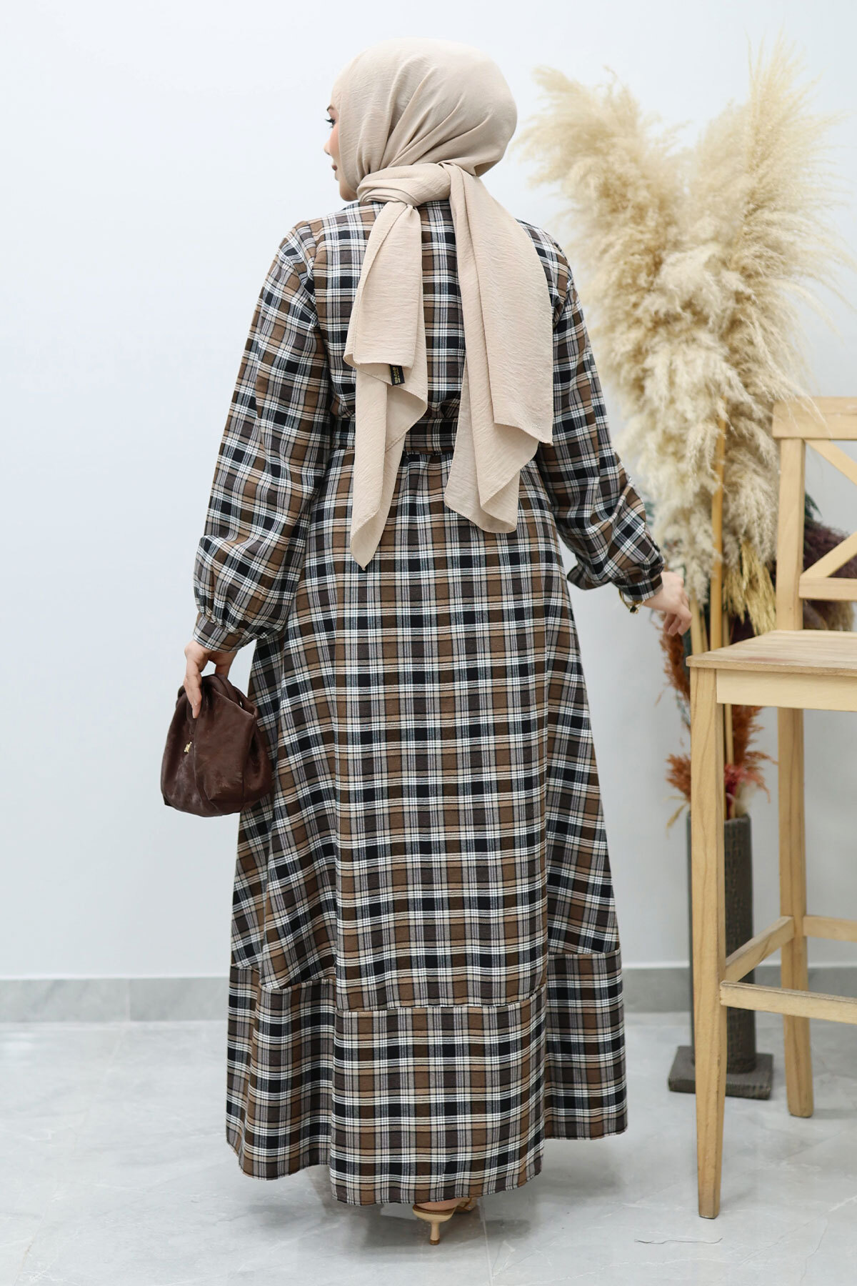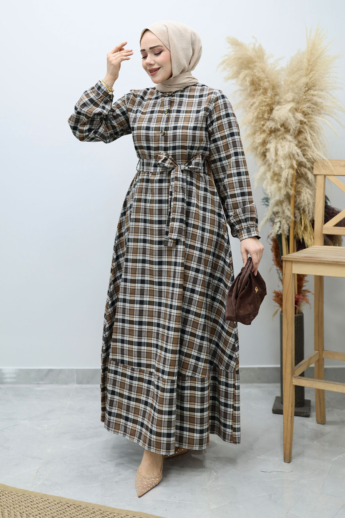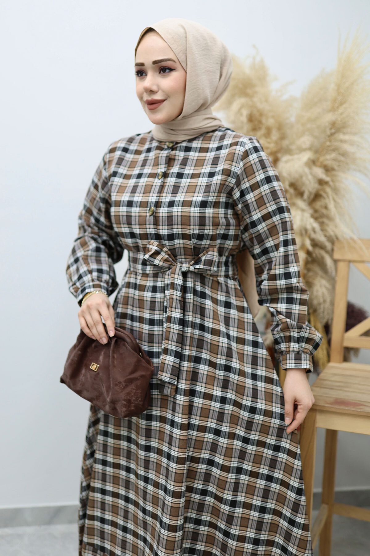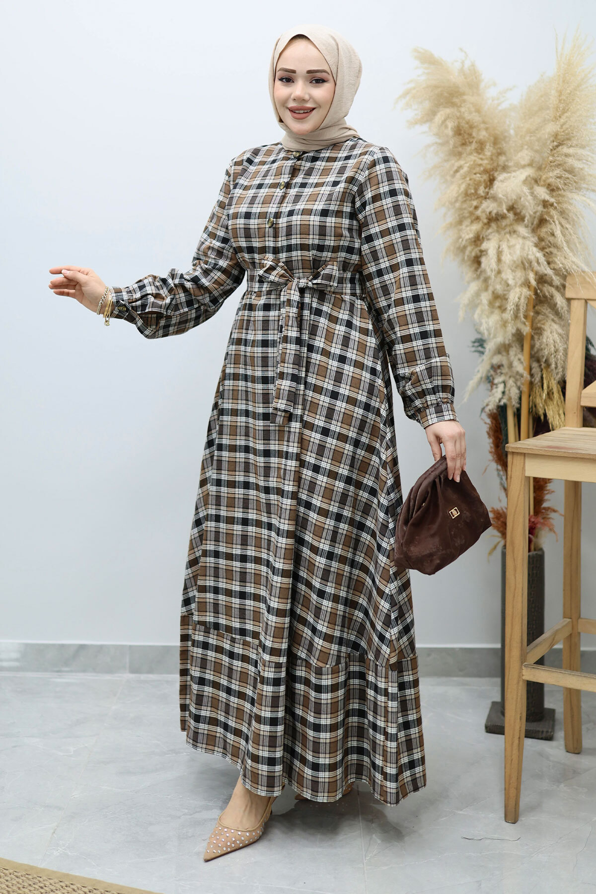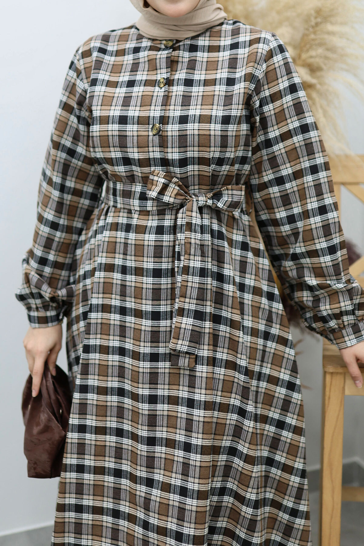 Önden Düğmeli Ekose Elbise TSD260131 Kahverengi Özellikleri