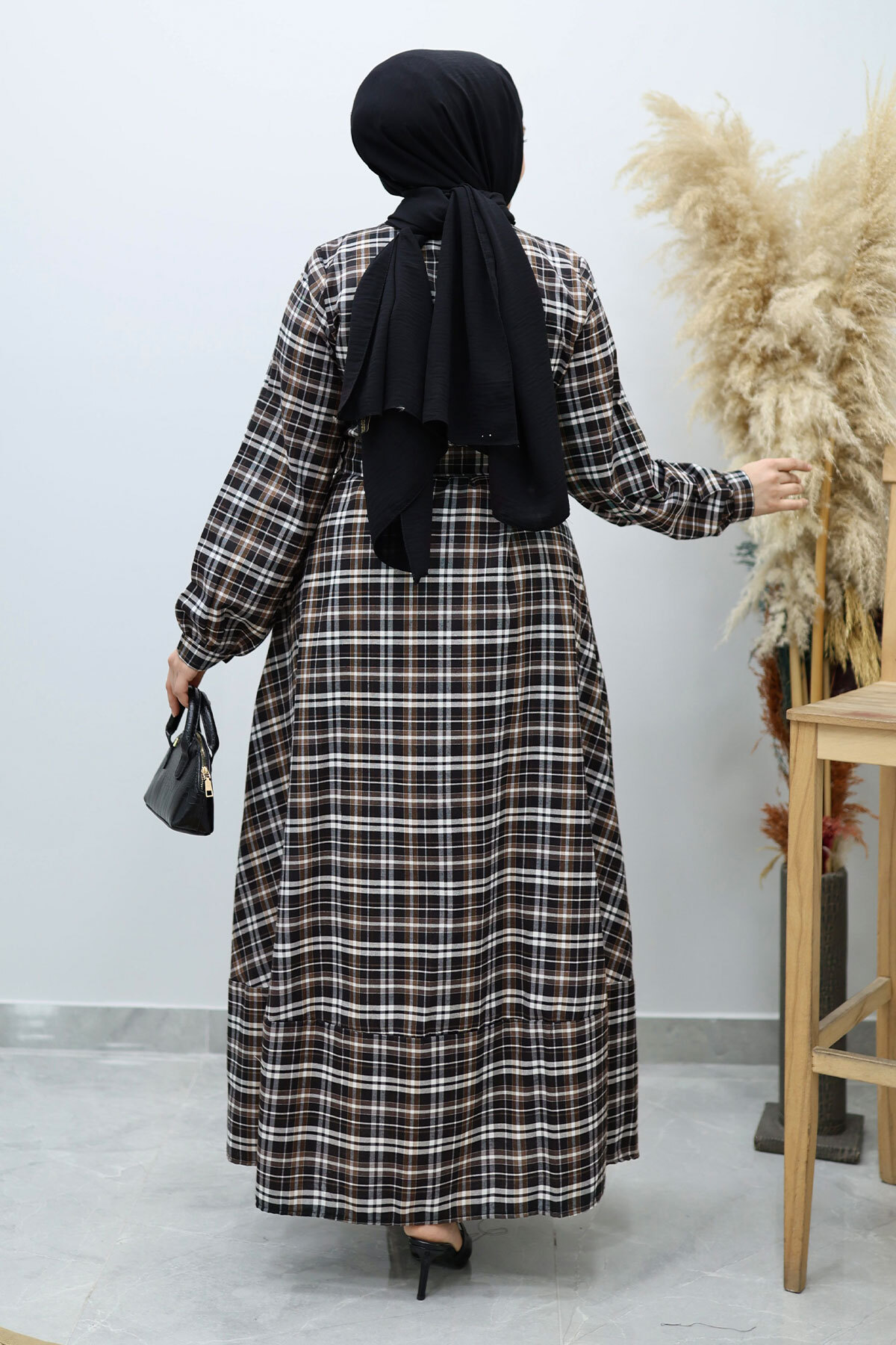 Önden Düğmeli Ekose Elbise TSD260131 Siyah Özellikleri