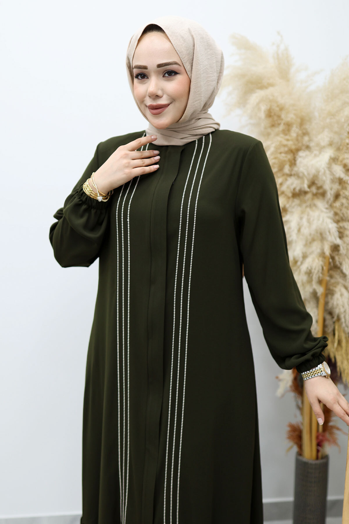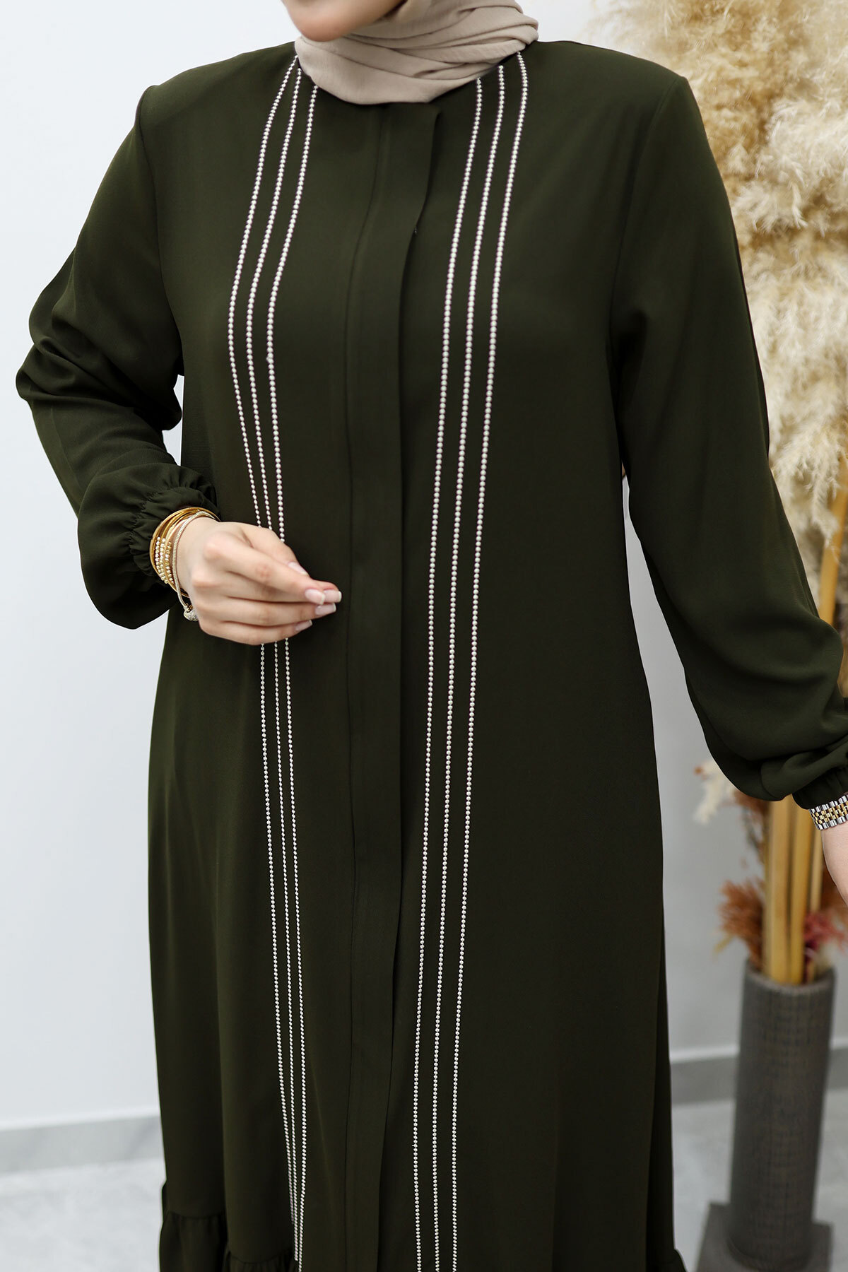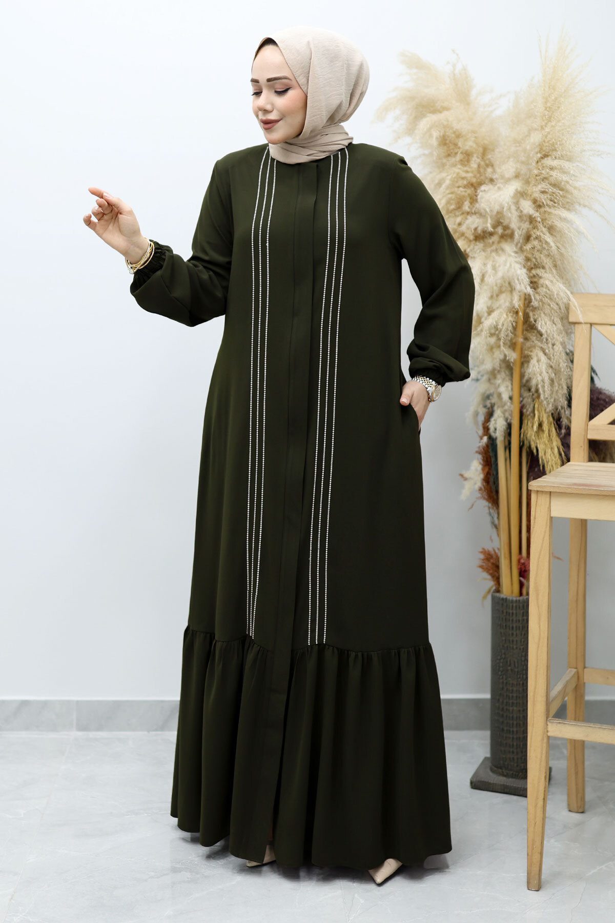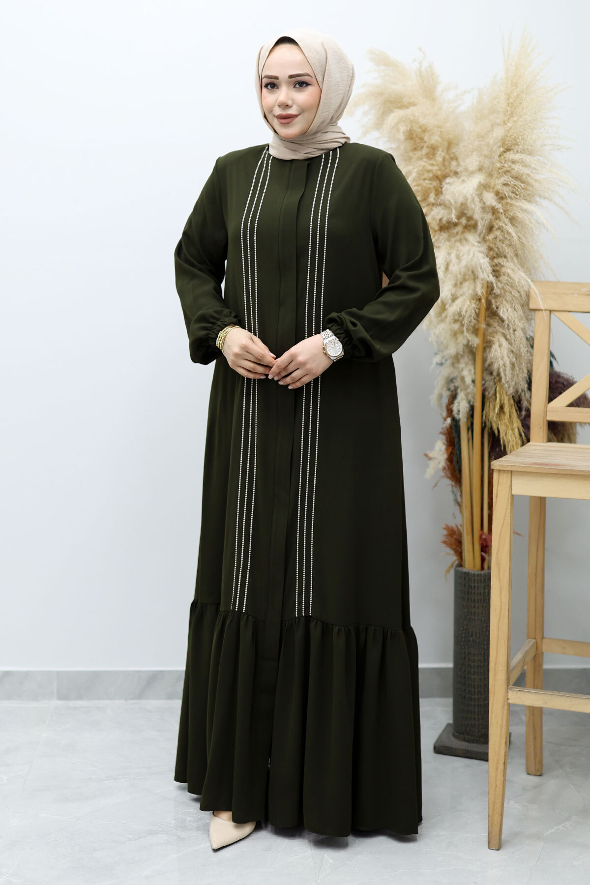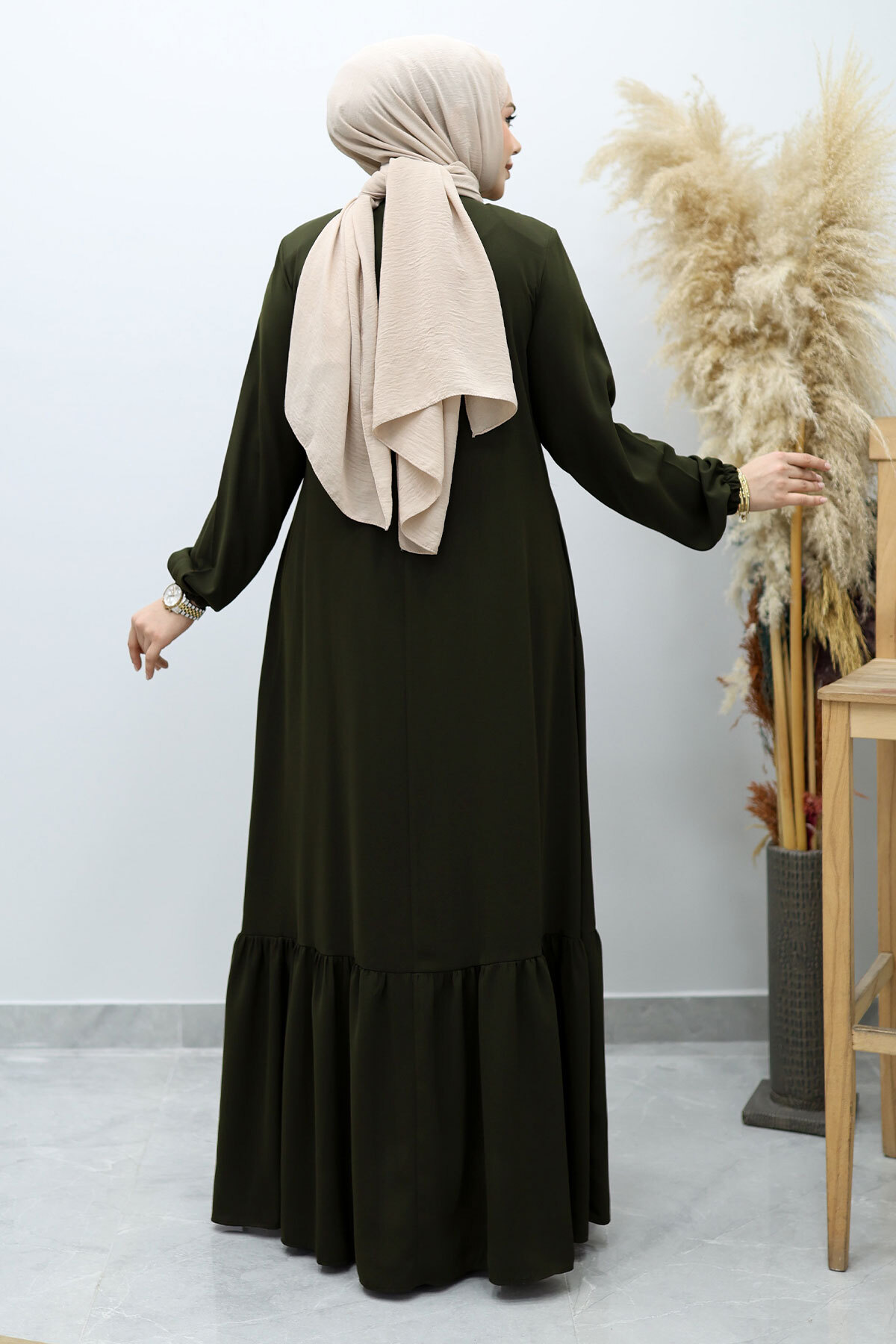 Önü Biyeli Volanlı Tesettür Ferace TSD260143 Haki Özellikleri