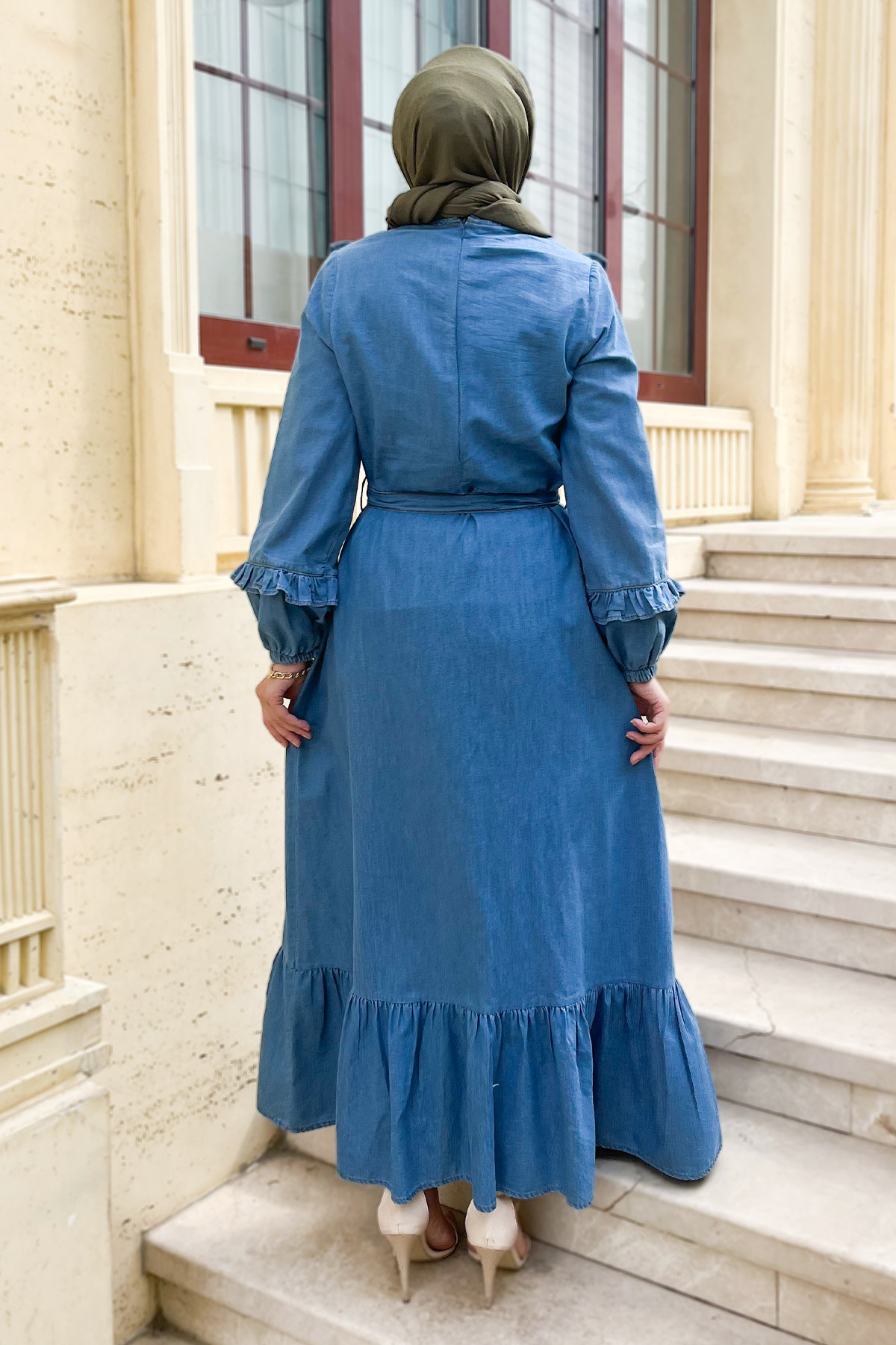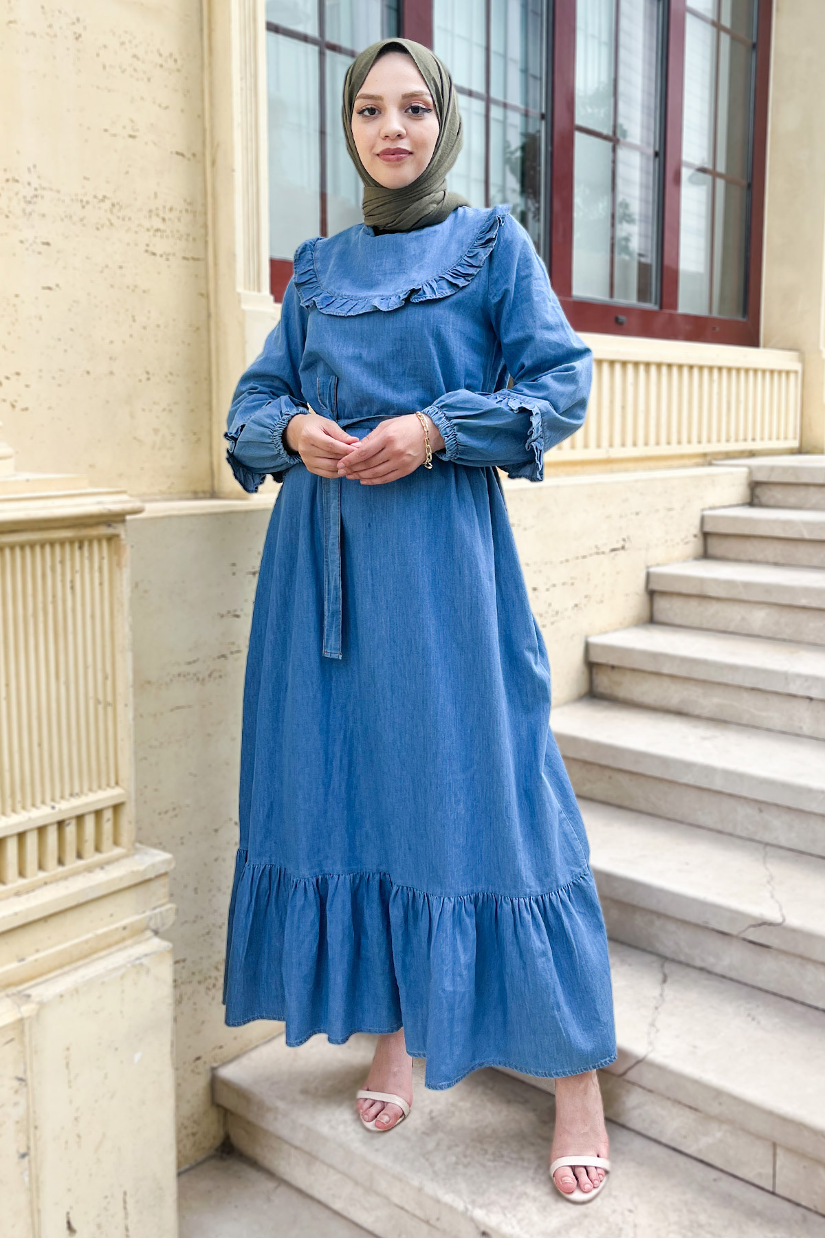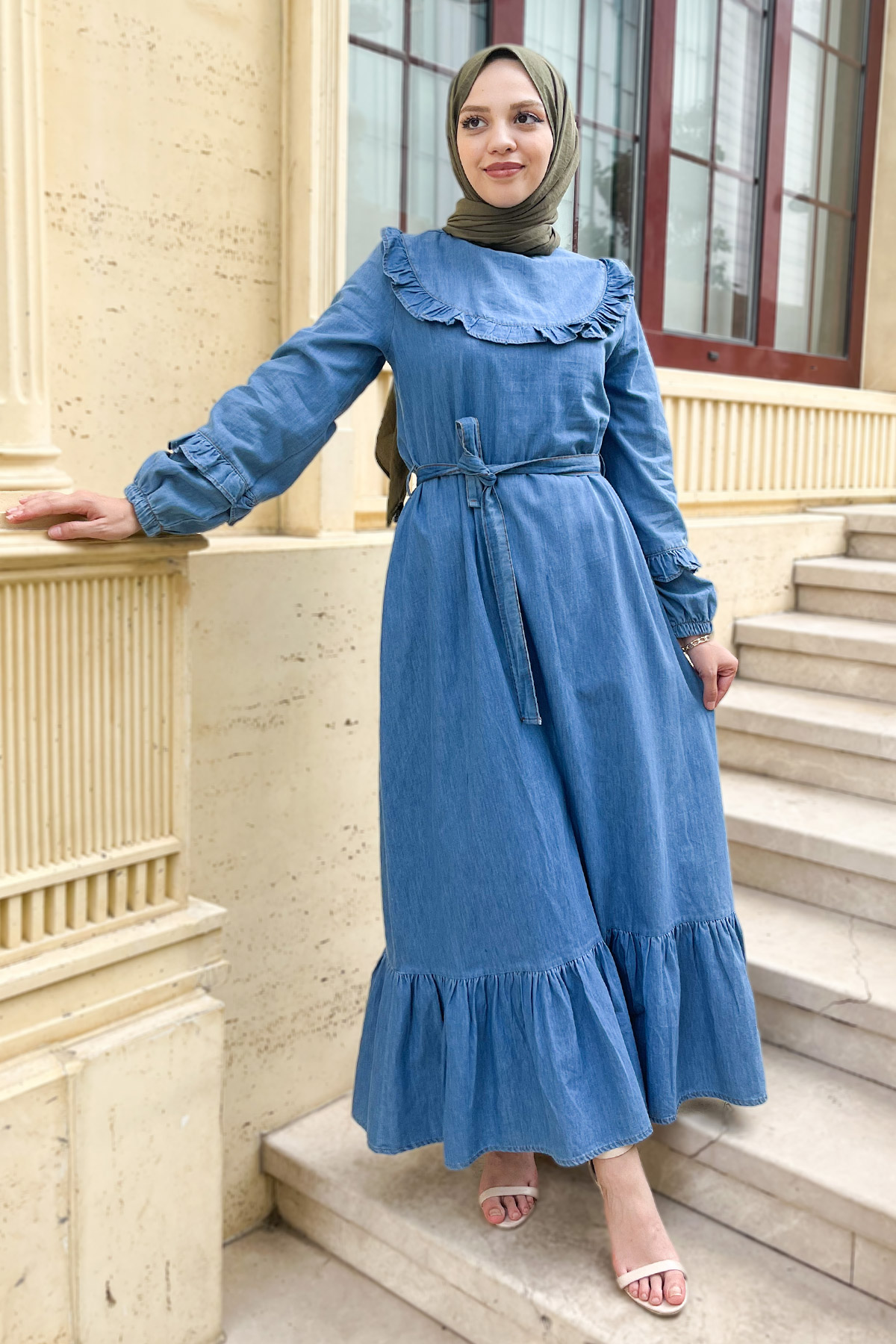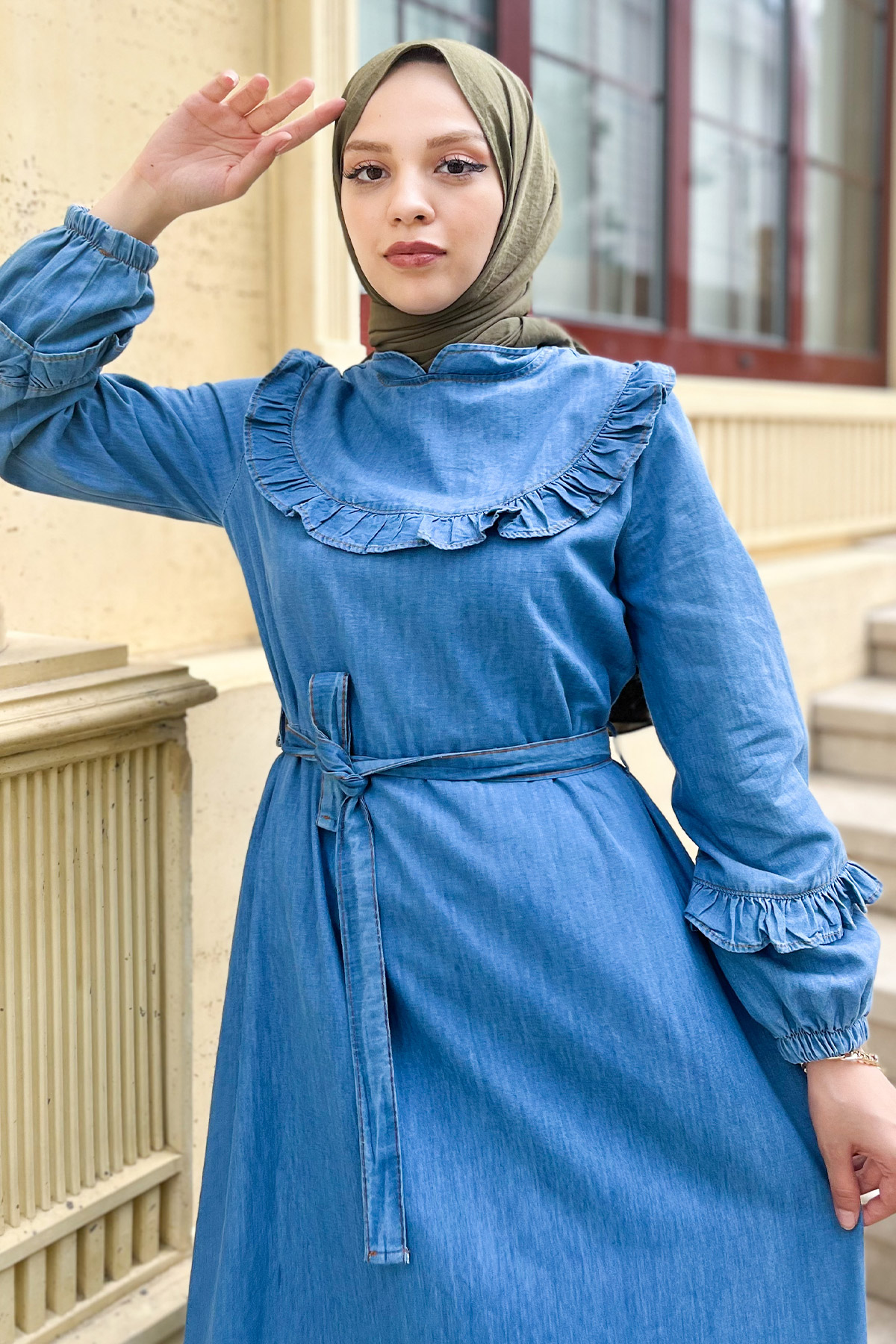 Ürün Özelliği : Yeni sezon Önü Fırfır Detaylı Kot Elbise modelidir. Kol uçları volanlıdır. Kol uçları lastiklidir. Yakası fırfır detaylıdır. Çıkarılabilir kuşağı vardır. Ürün renginde konsept çekimlerinden dolayı ton farklılığı olabilir.