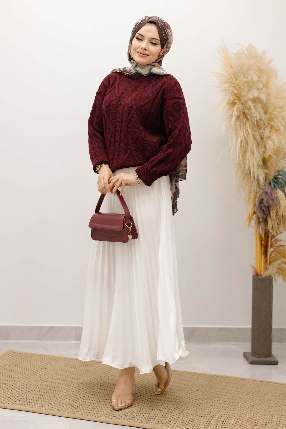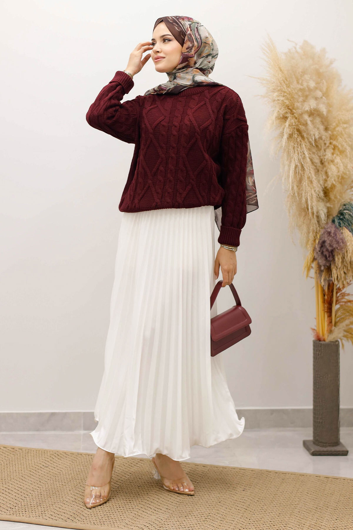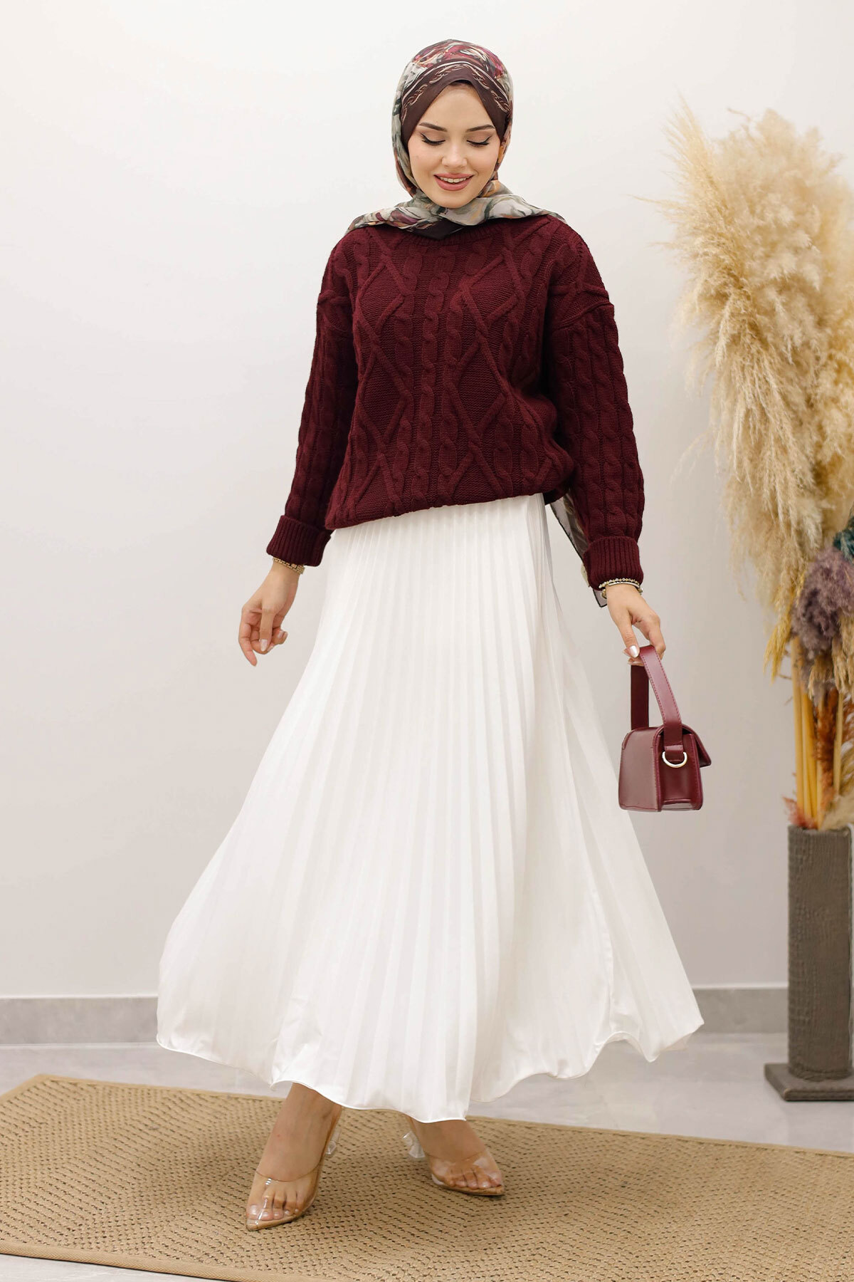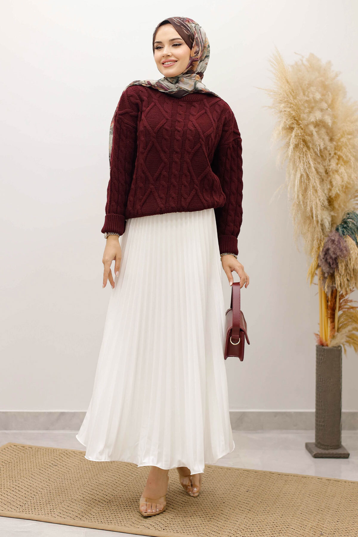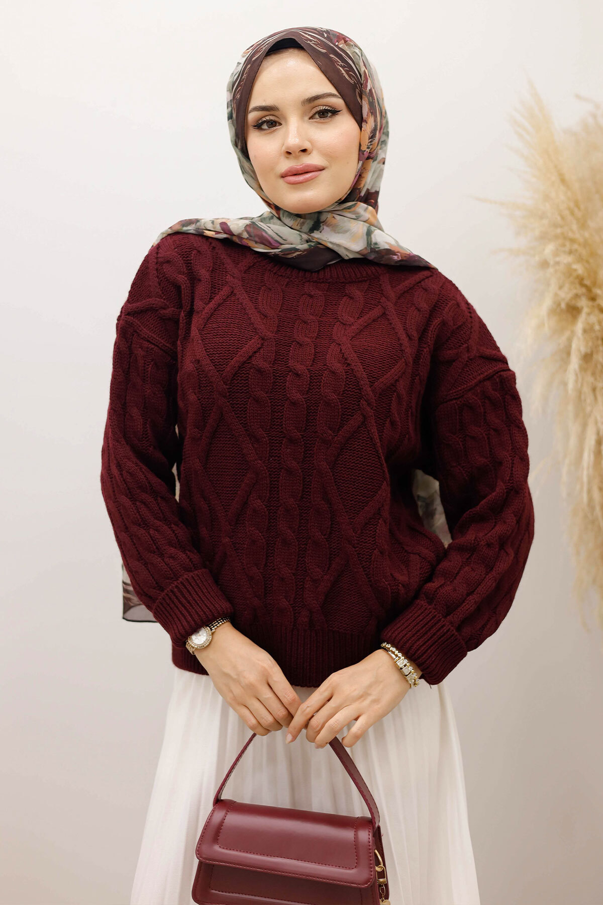 Örgü Desenli Kazak TSD250222 Bordo