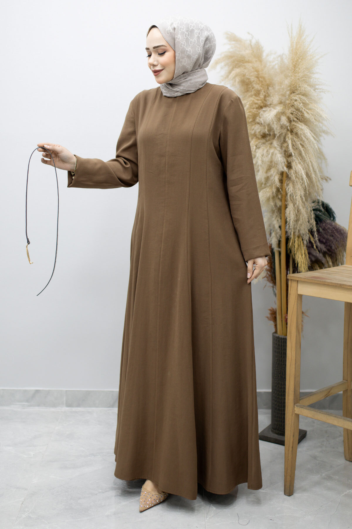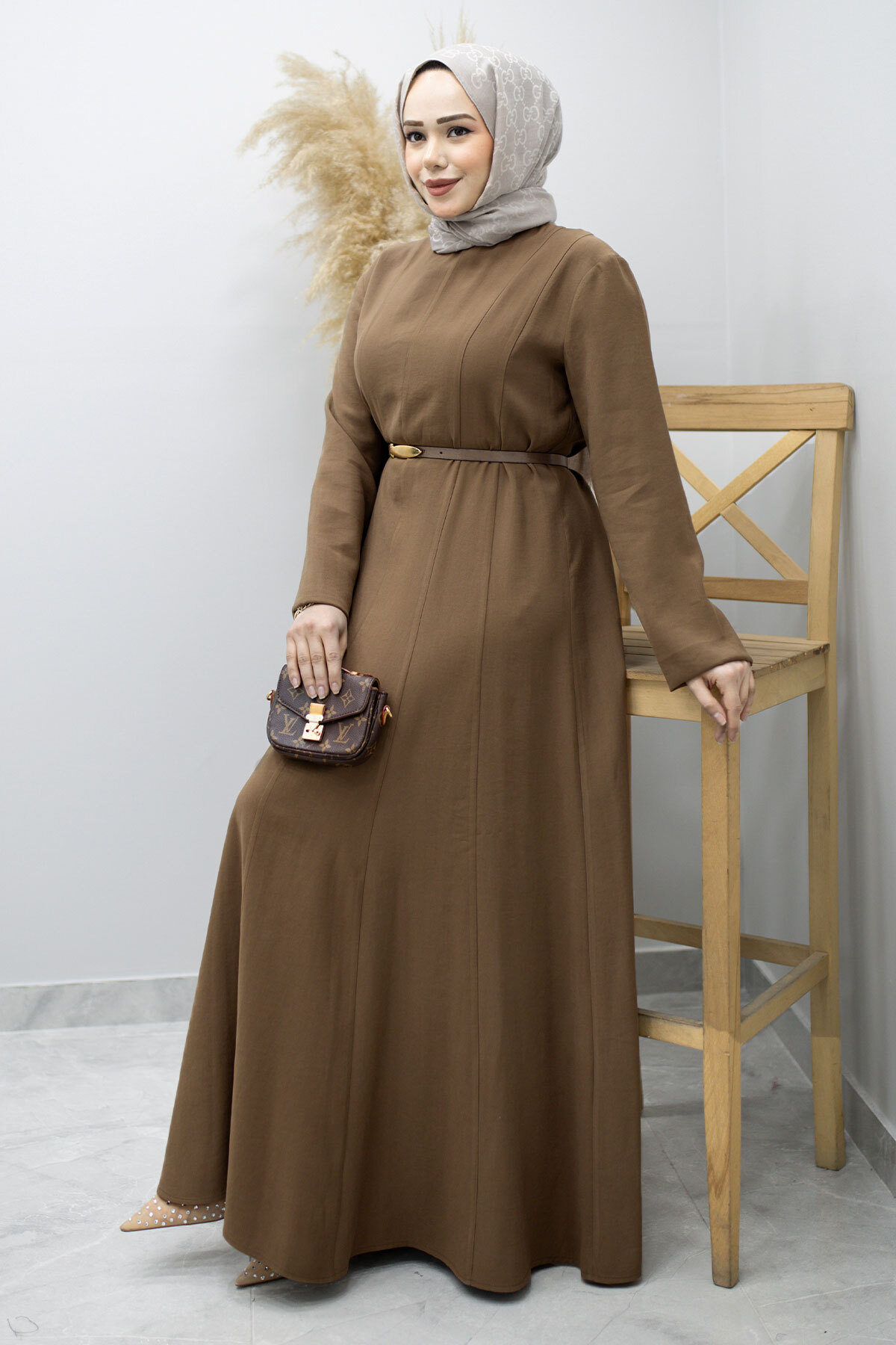 Pensli Hakim Yaka Kemerli Elbise TSD260184 Kahverengi Özellikleri