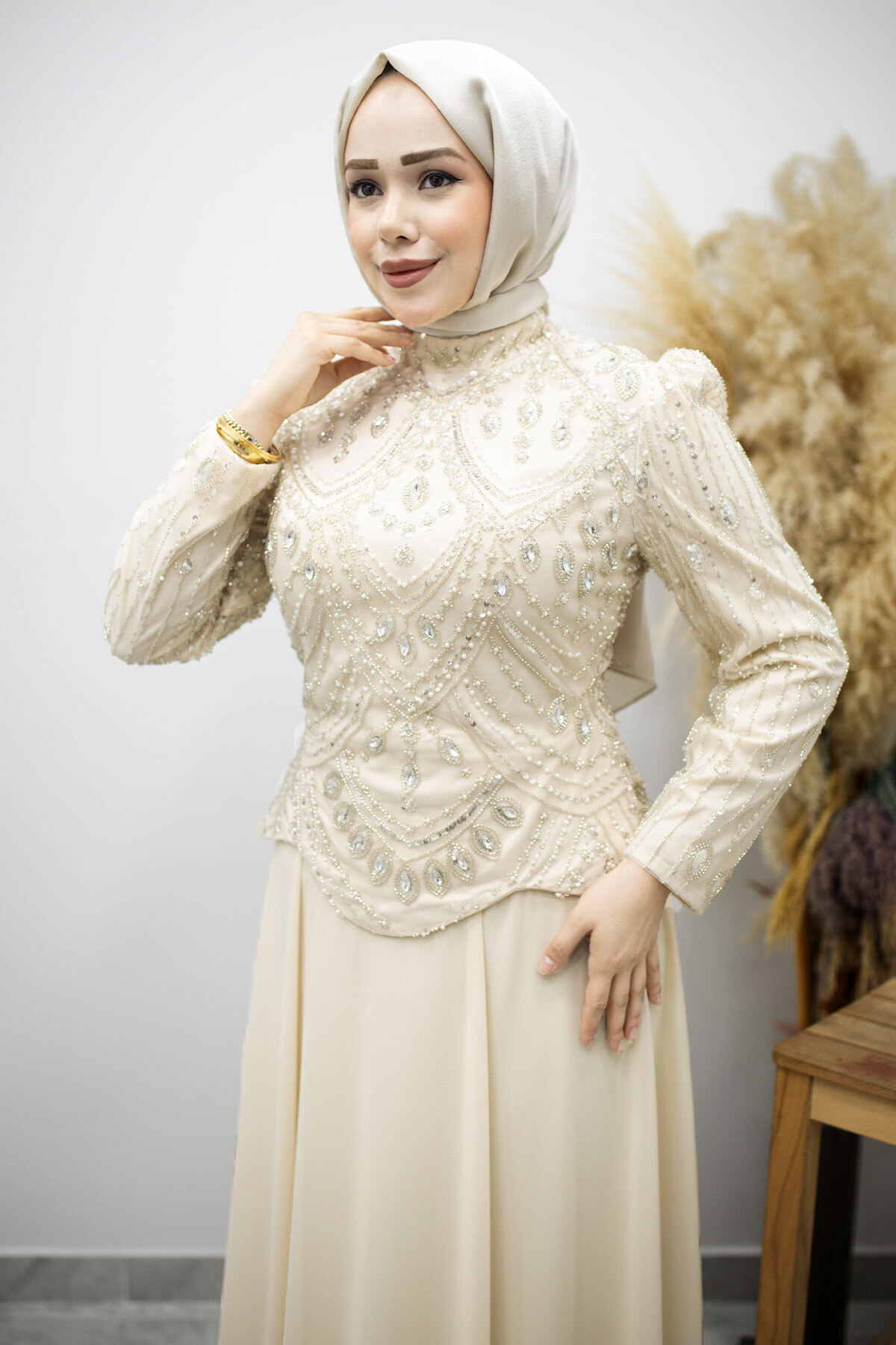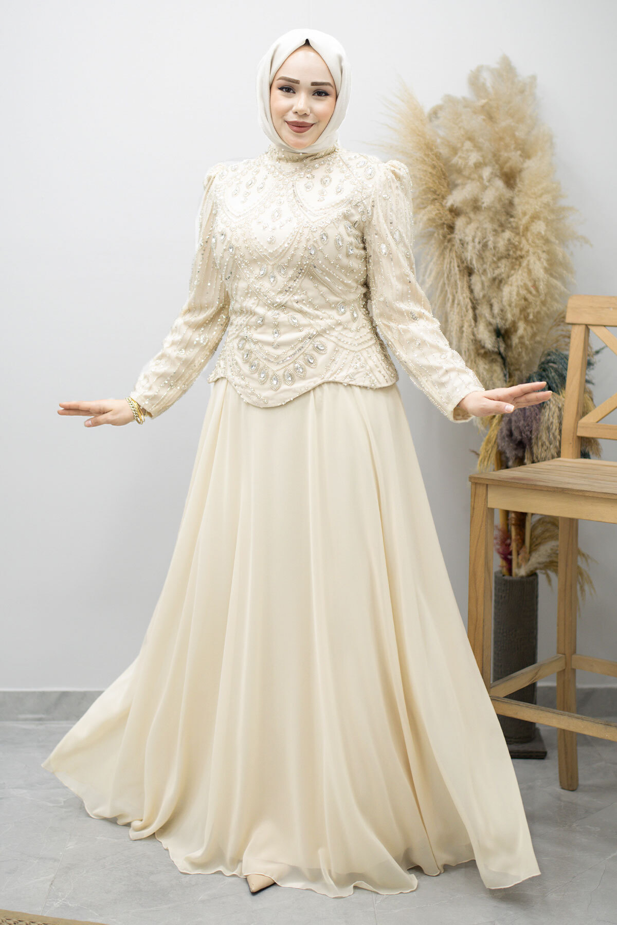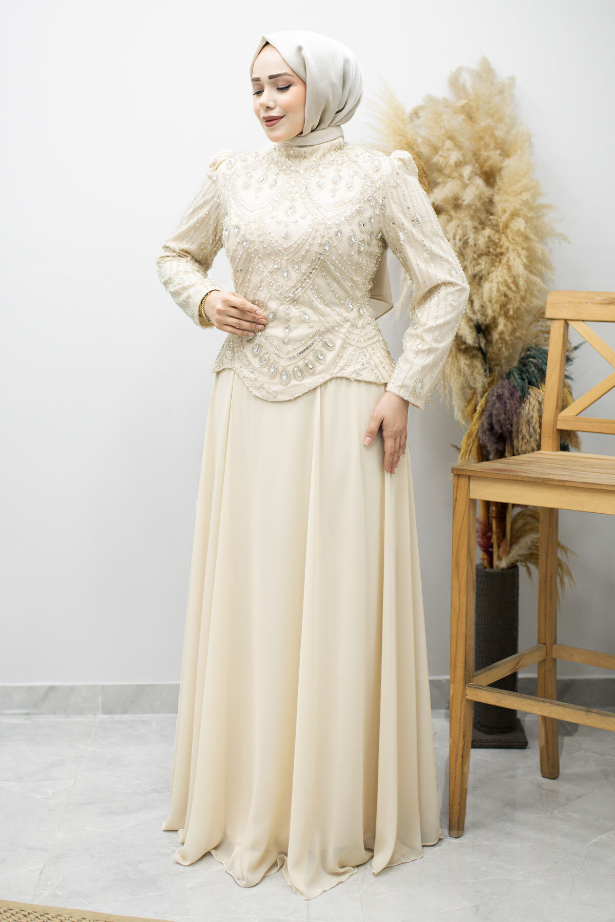 Boncuk Ve Taş İşlemeli Tesettür Abiye TSD260197 BejÖzellikleri