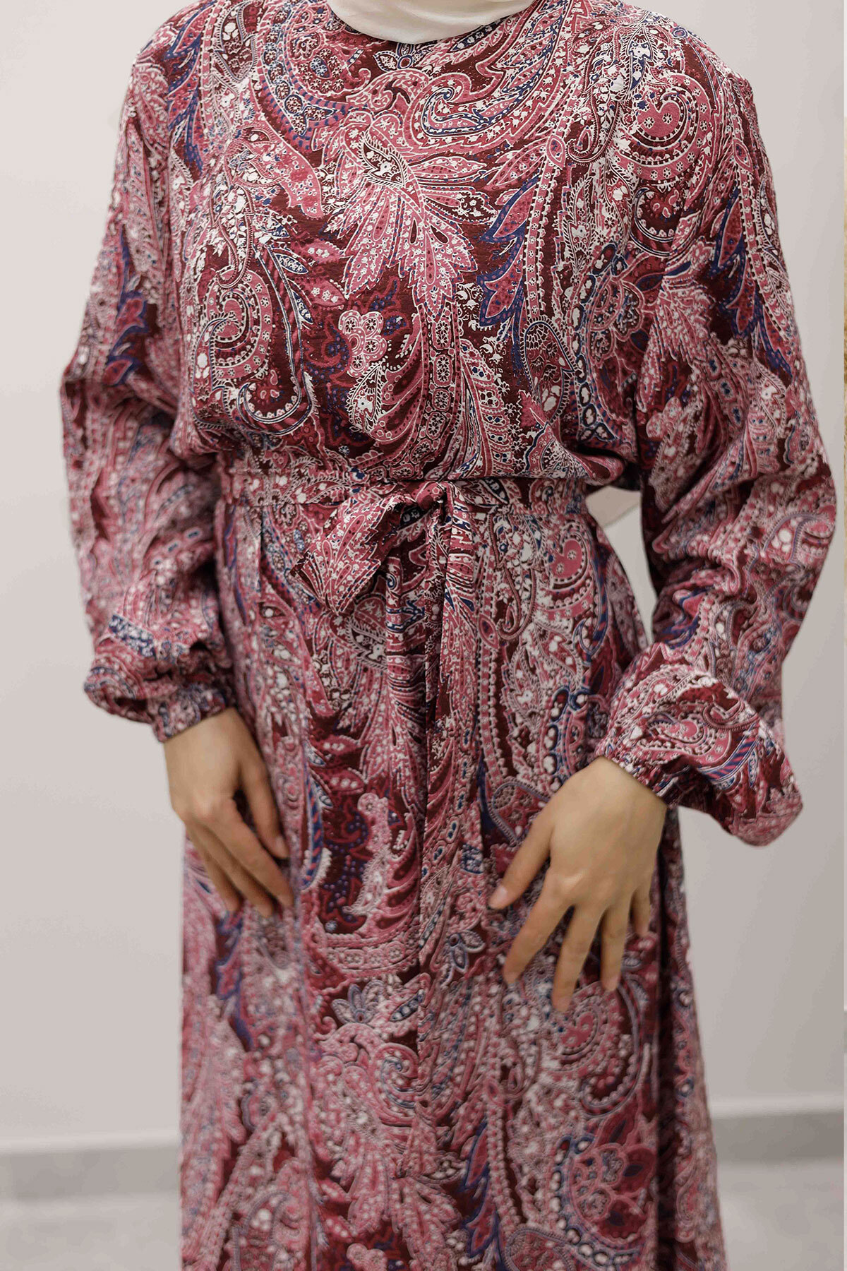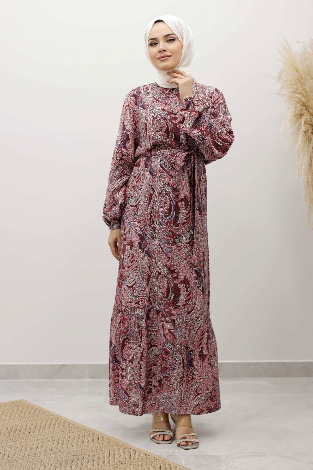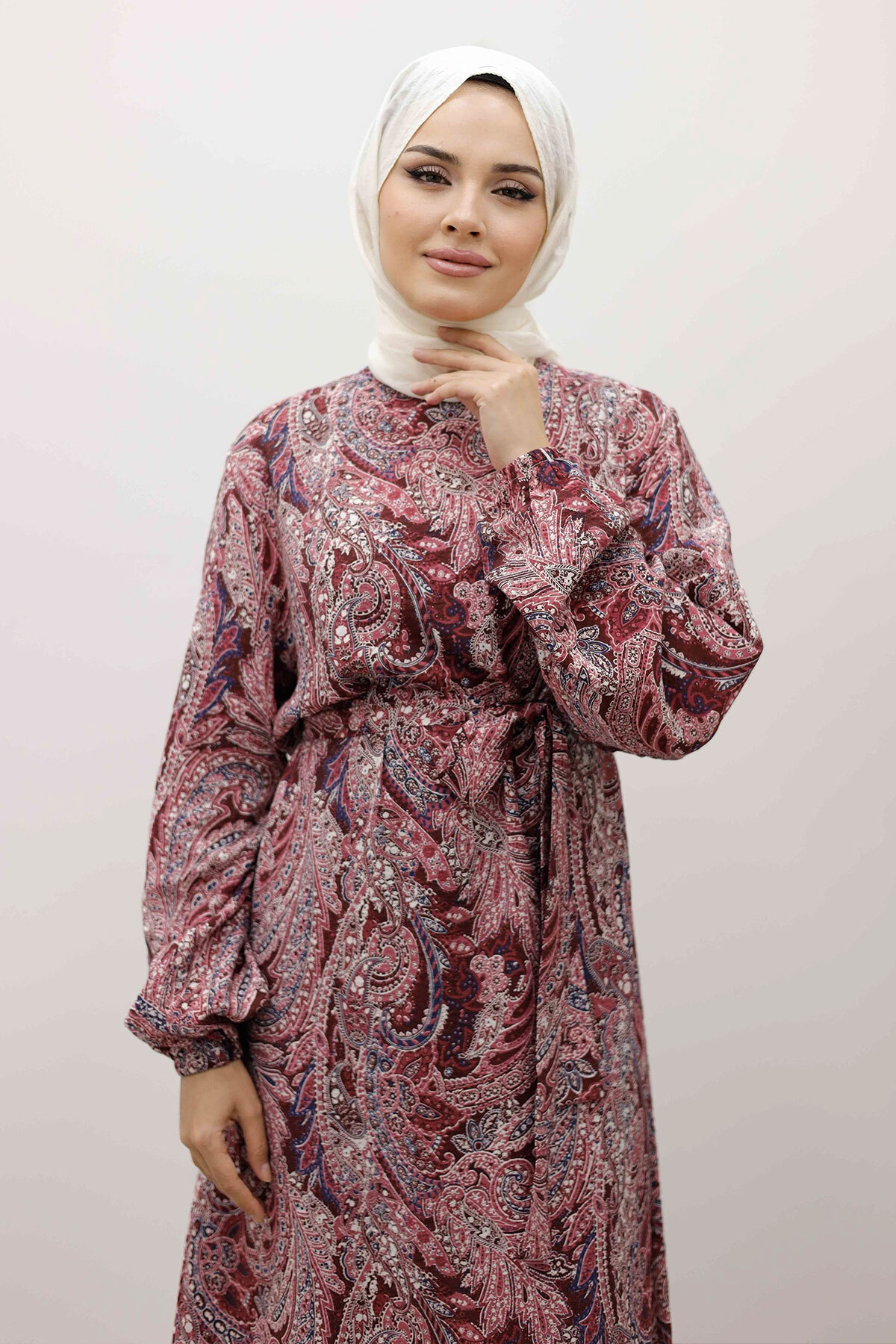 Şal Desen Kuşaklı Elbise TSD250257 Bordo