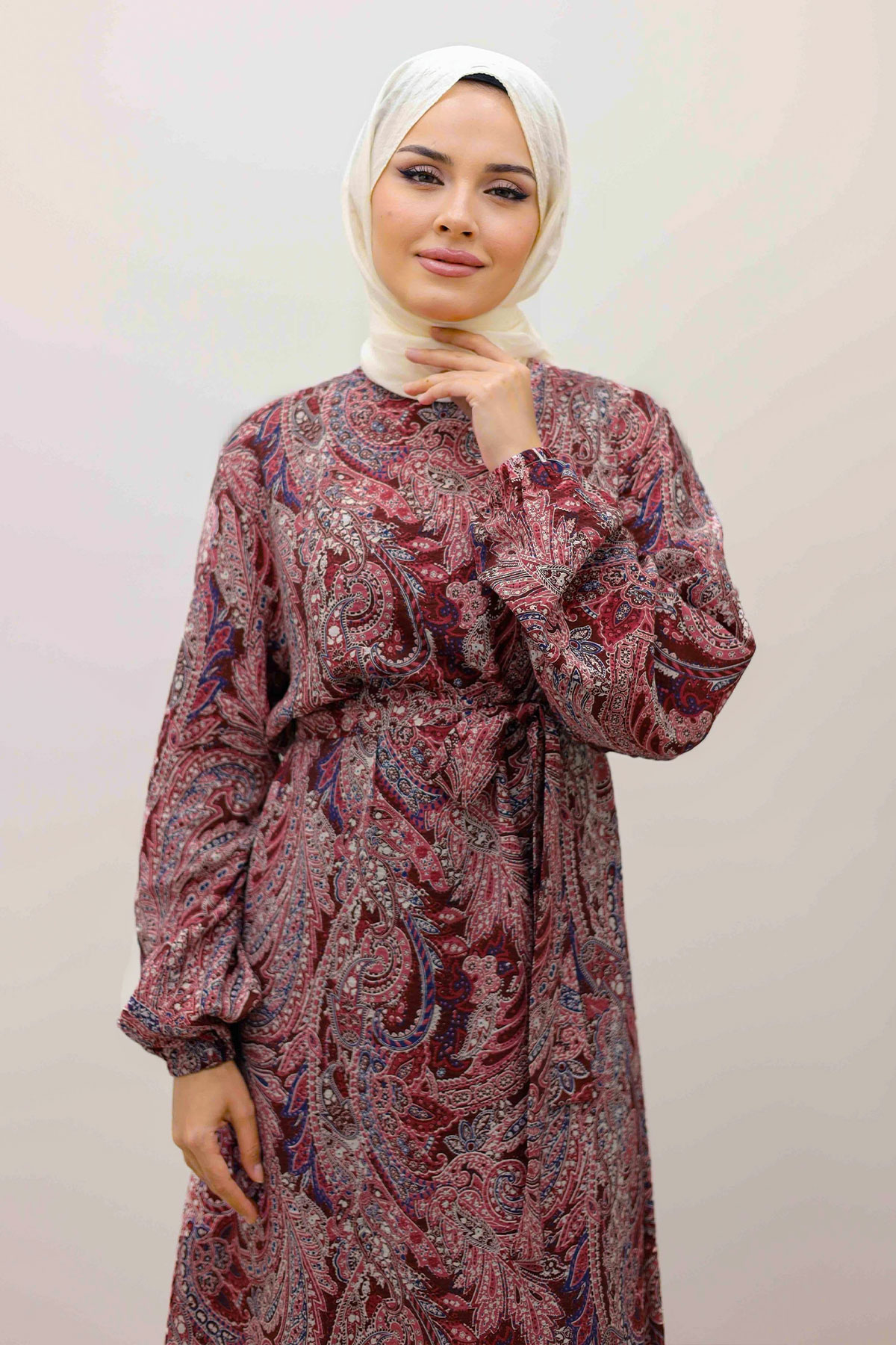 Şal Desen Kuşaklı Elbise TSD250257 Bordo Özellikleri