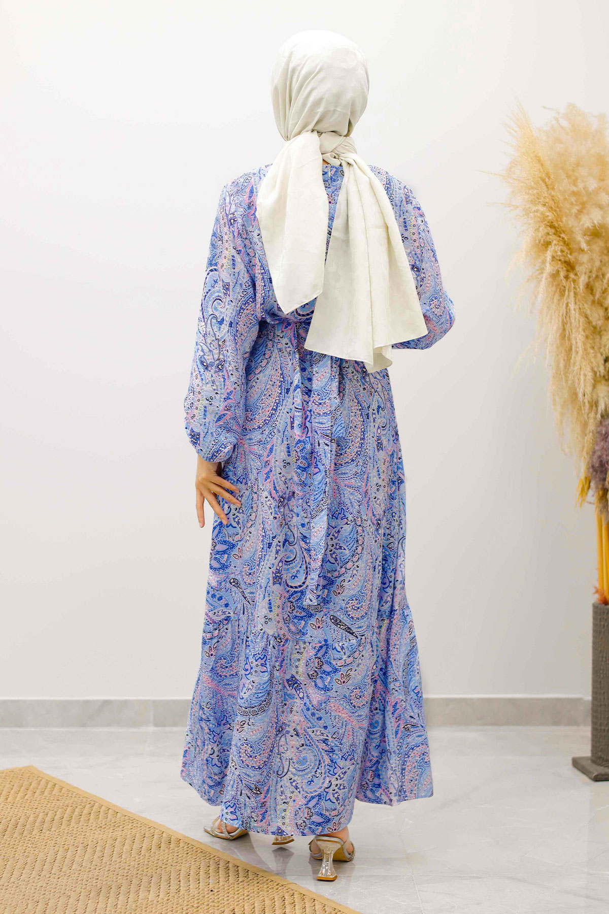 Şal Desen Kuşaklı Elbise TSD250257 Mavi