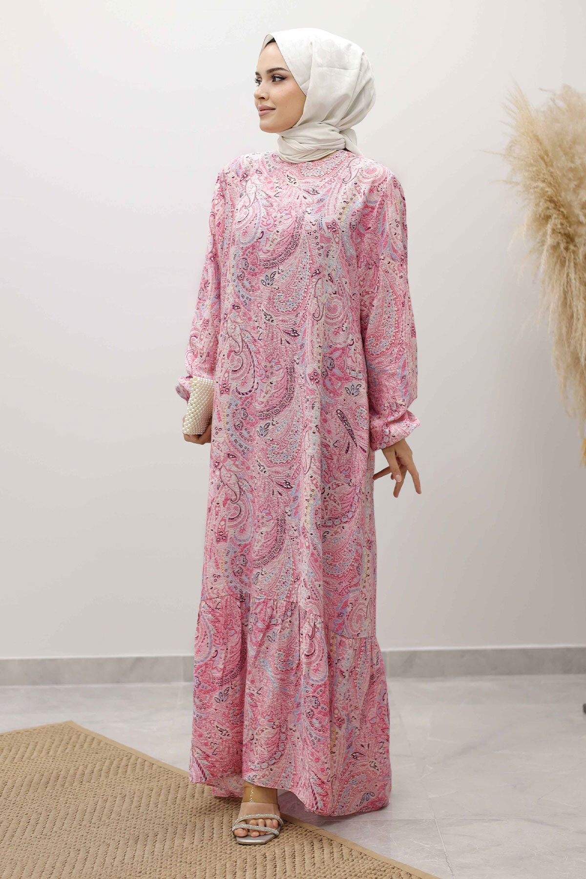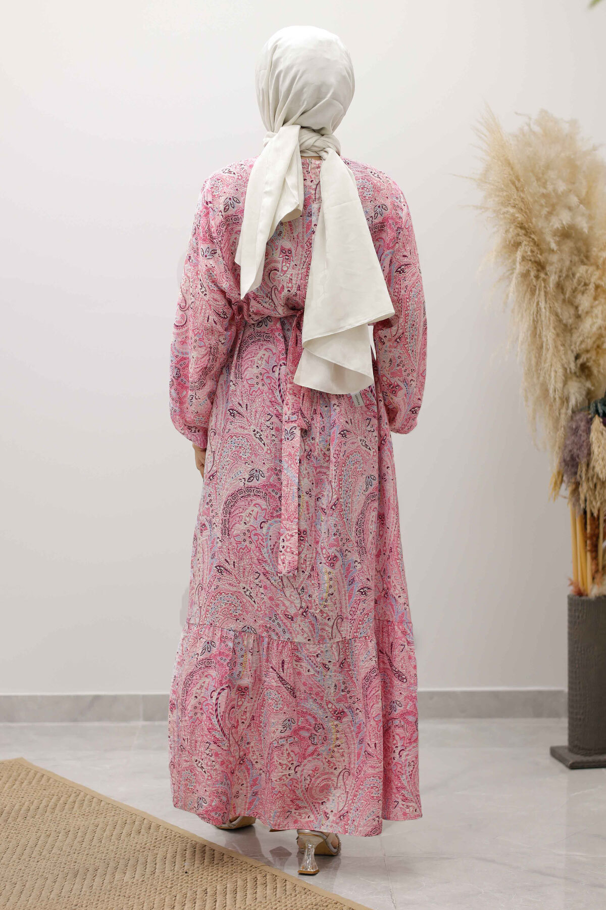 Şal Desen Kuşaklı Elbise TSD250257 Pembe