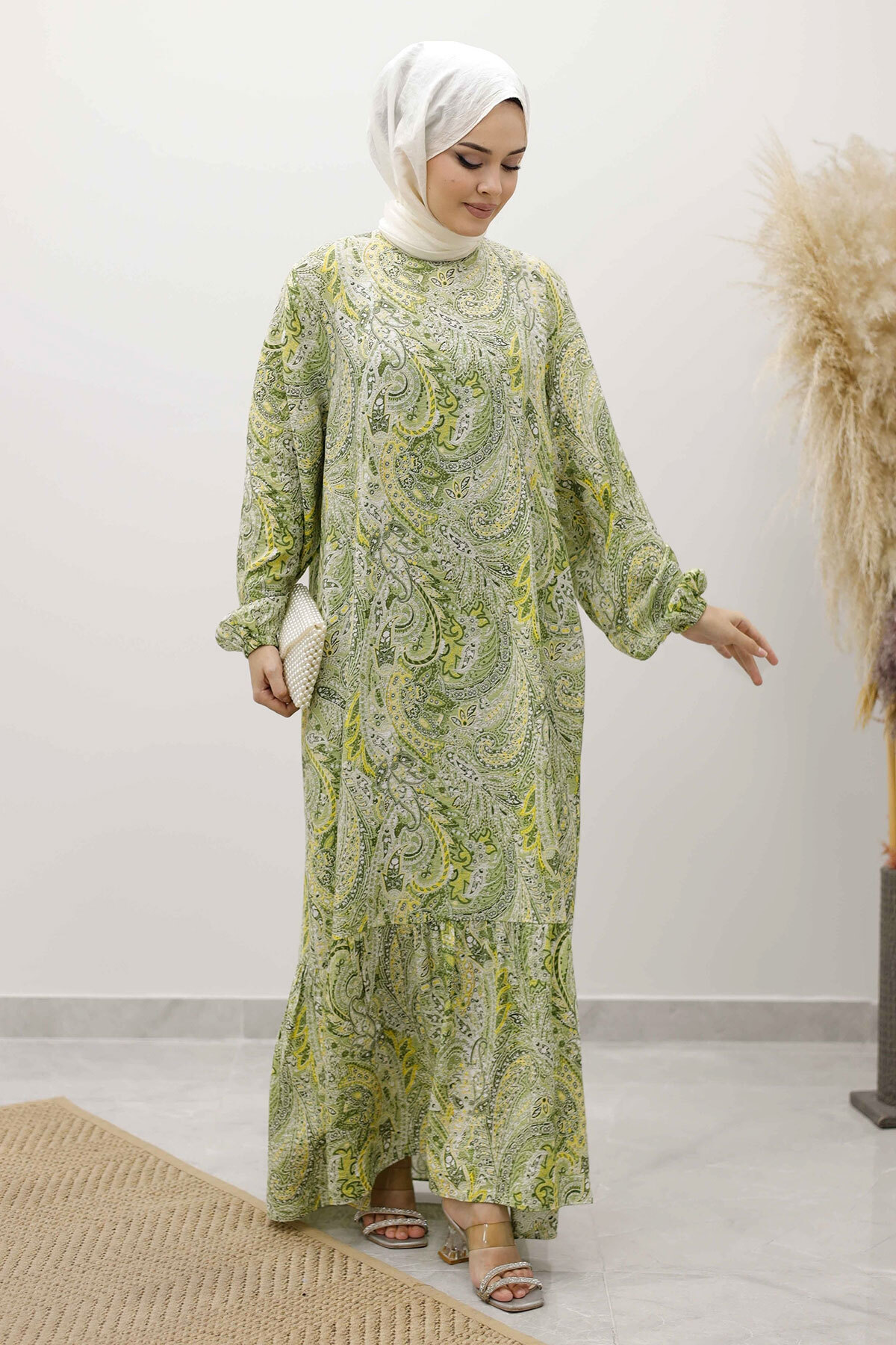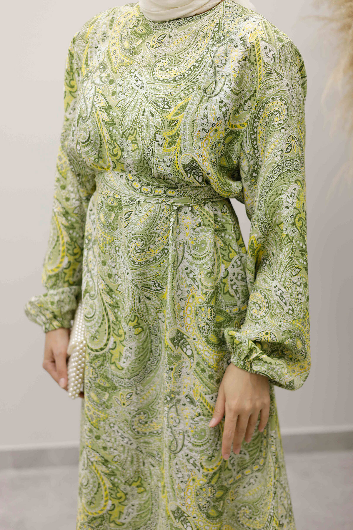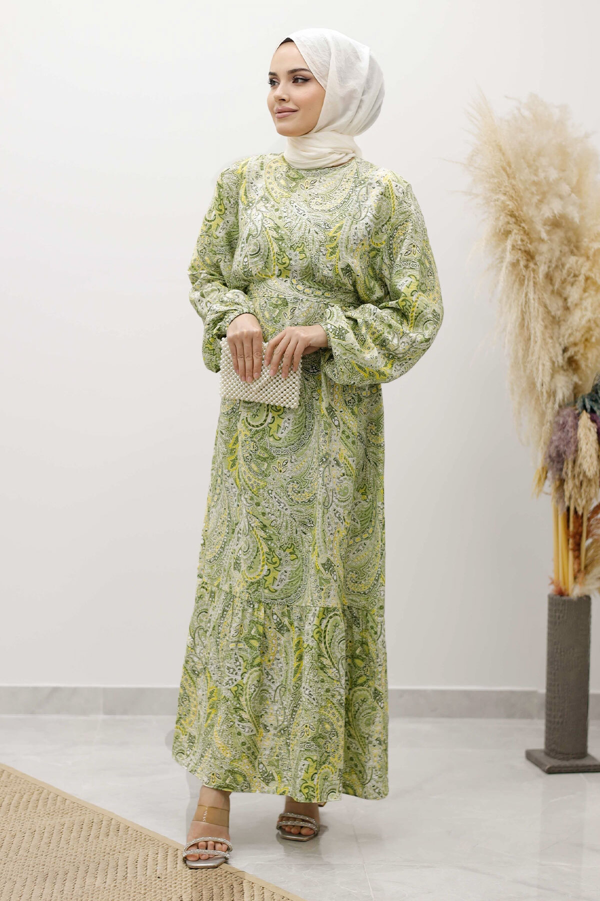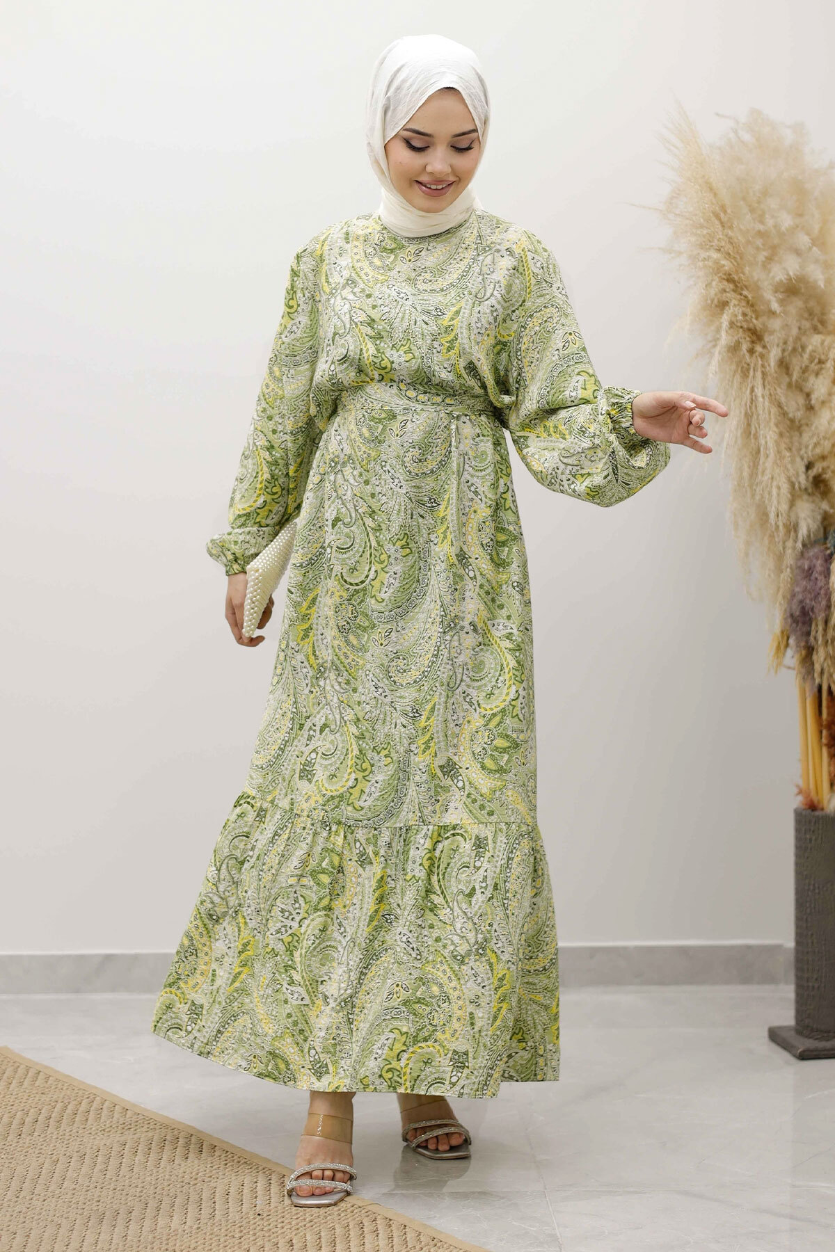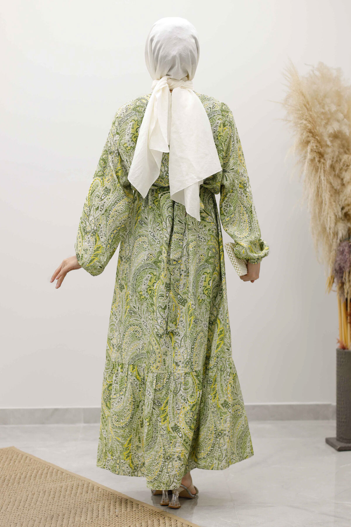 Şal Desen Kuşaklı Elbise TSD250257 Yeşil