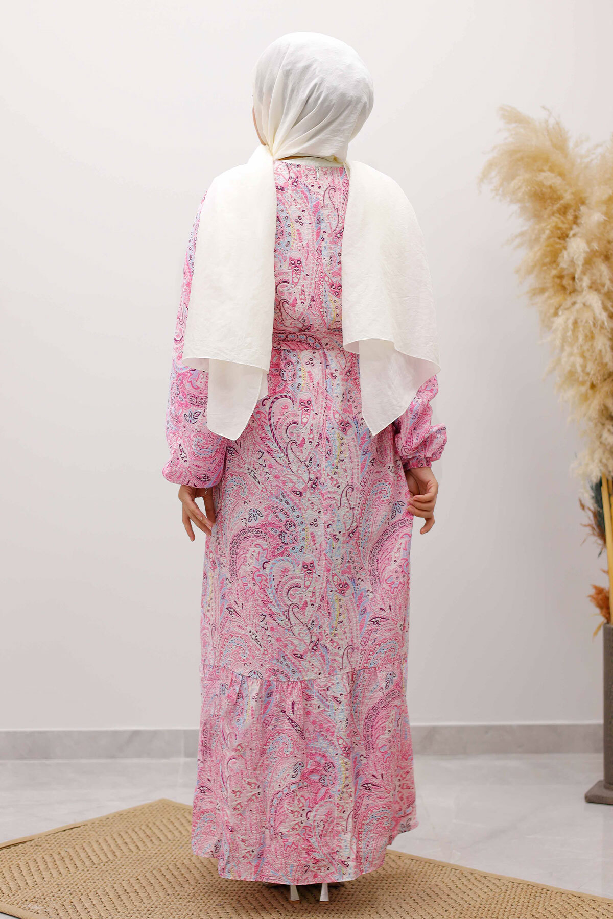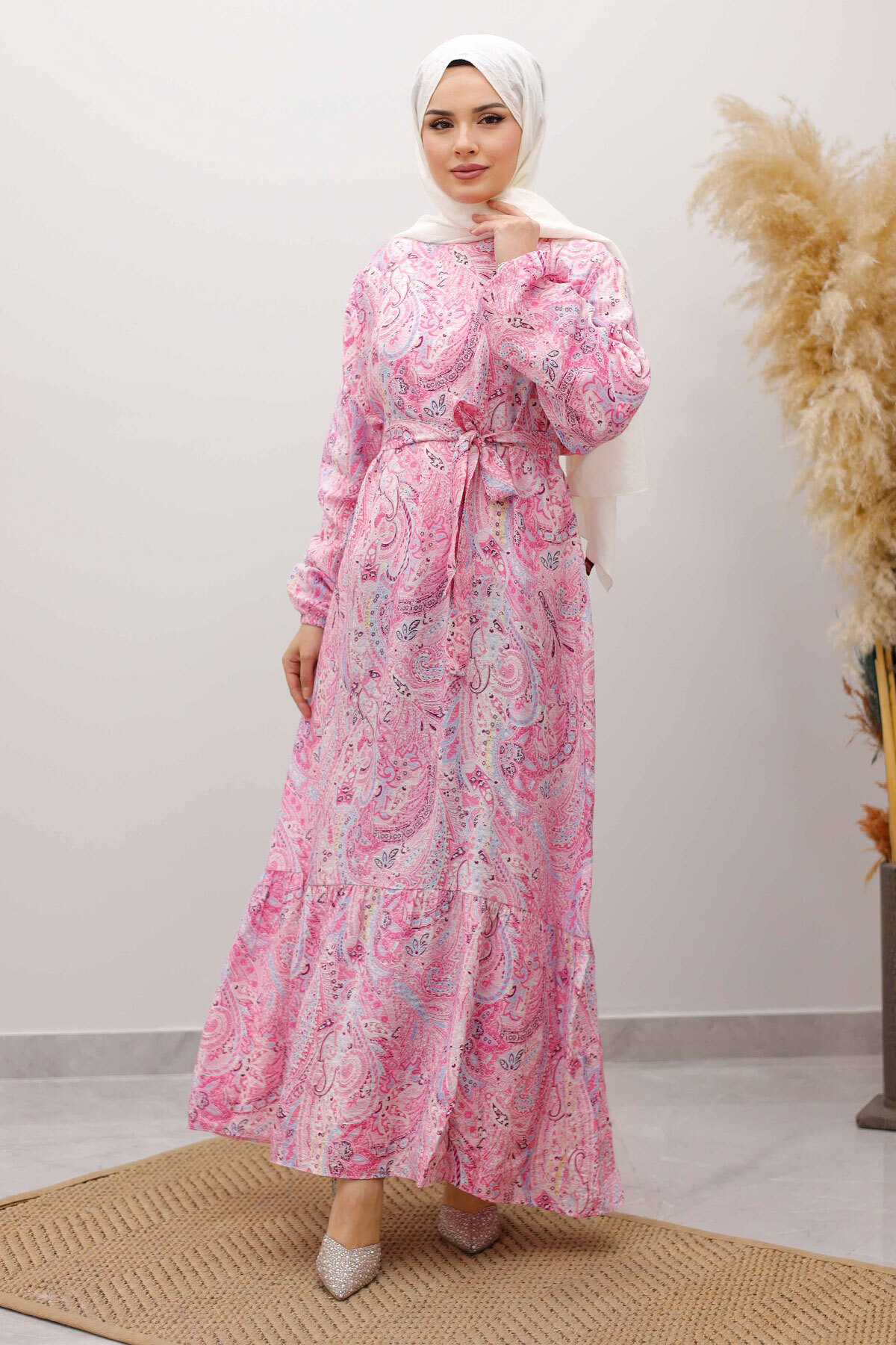 Şal Desen Kuşaklı Elbise TSD260107 Pembe