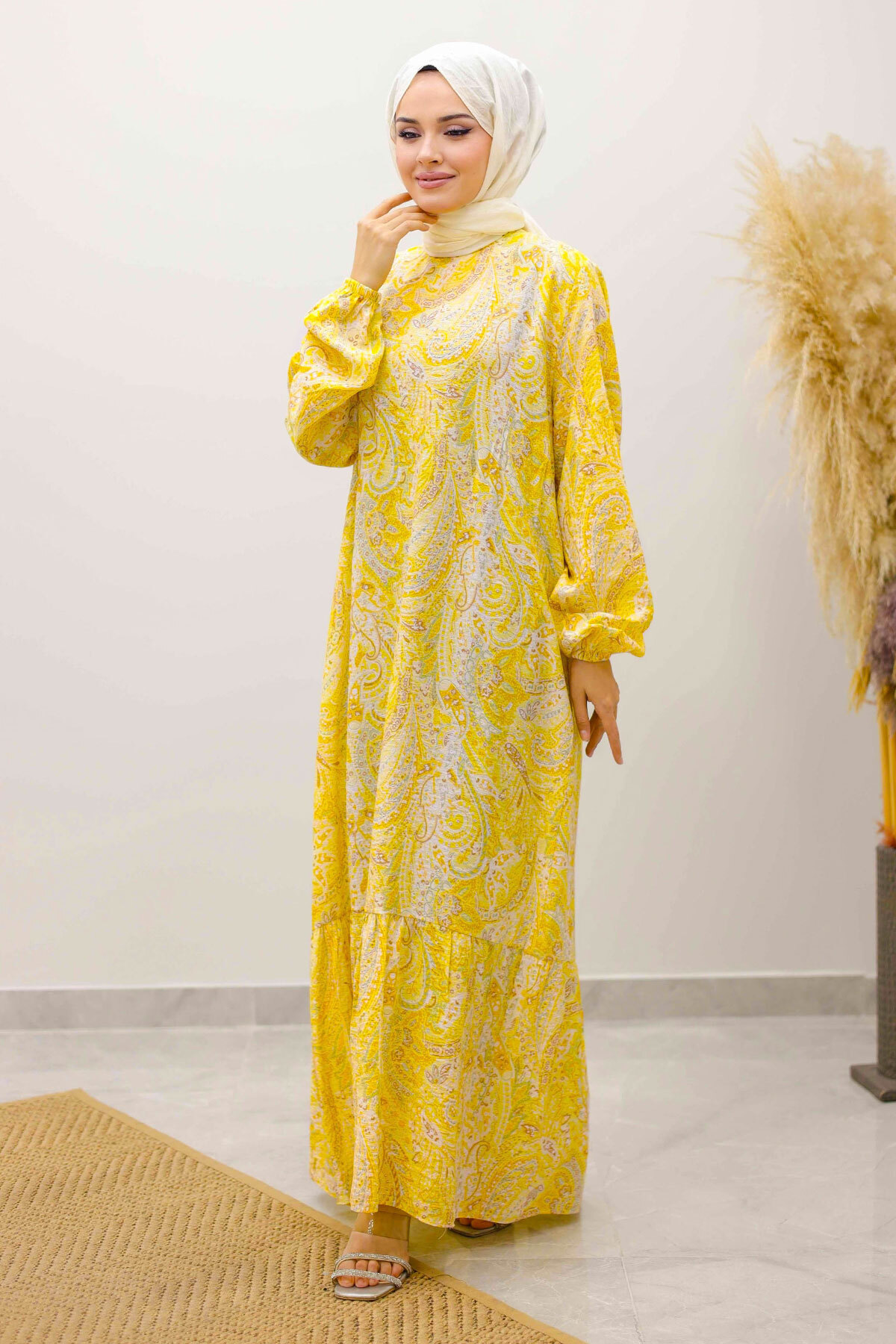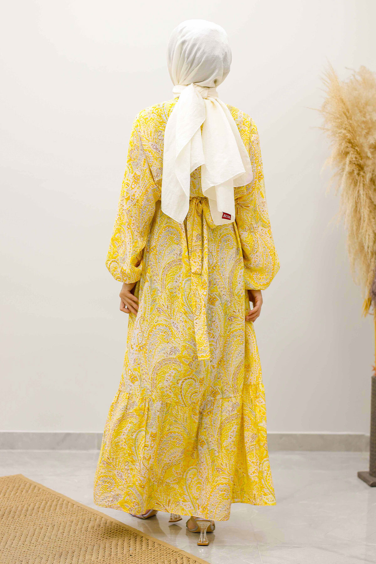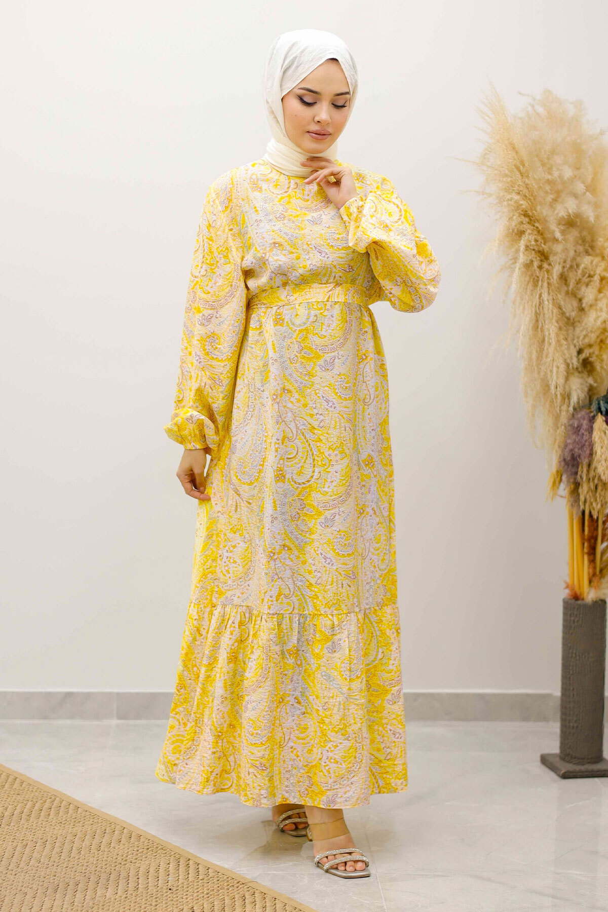 Şal Desen Kuşaklı Elbise TSD250257 Sarı Özellikleri