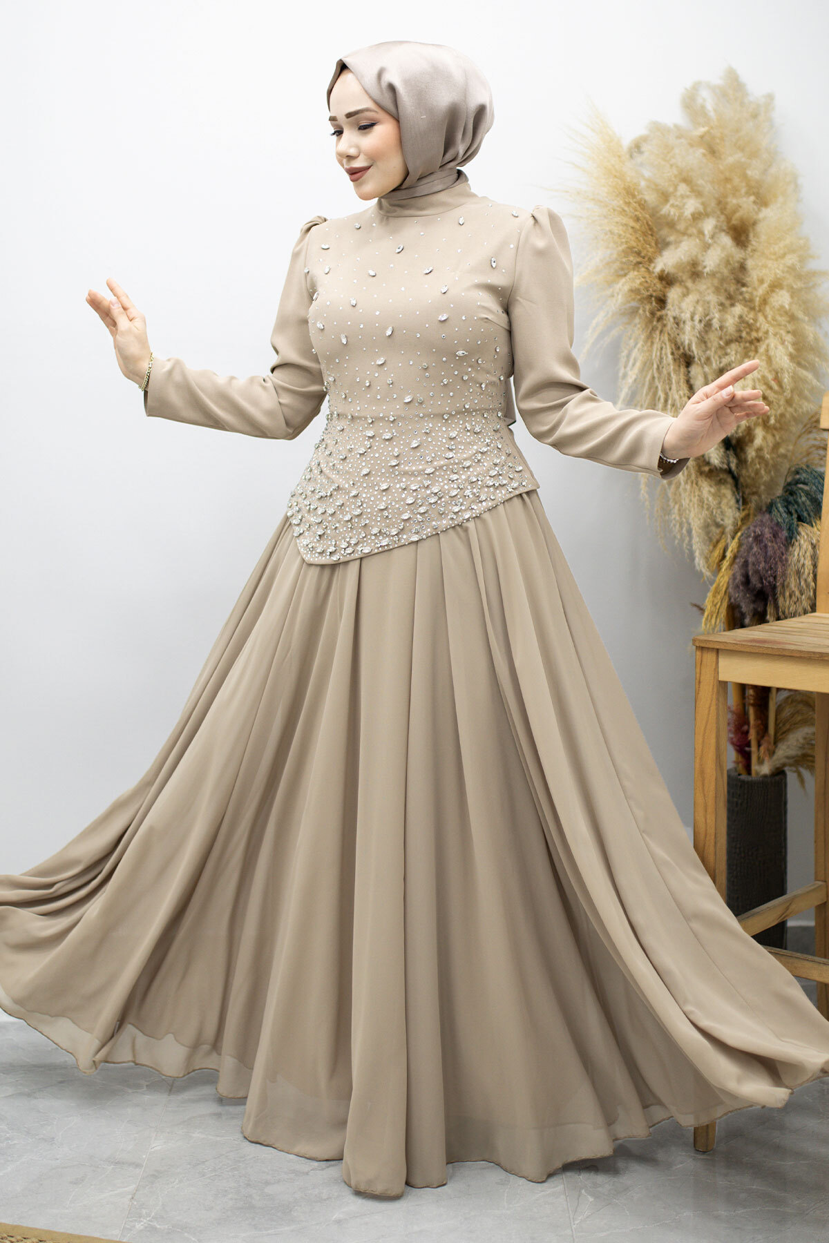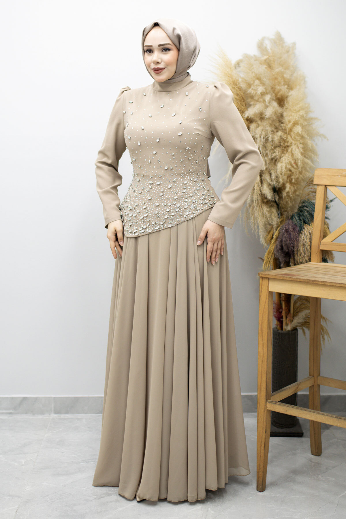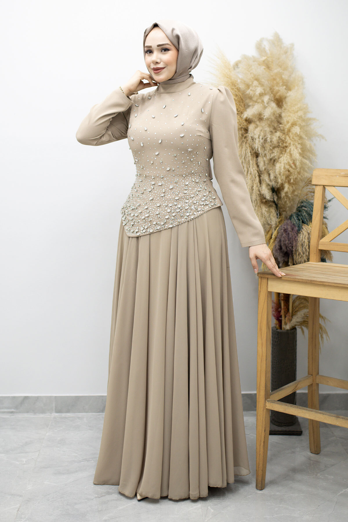 Şifon Etekli Taşlı Tesettür Abiye TSD260199 Vizon