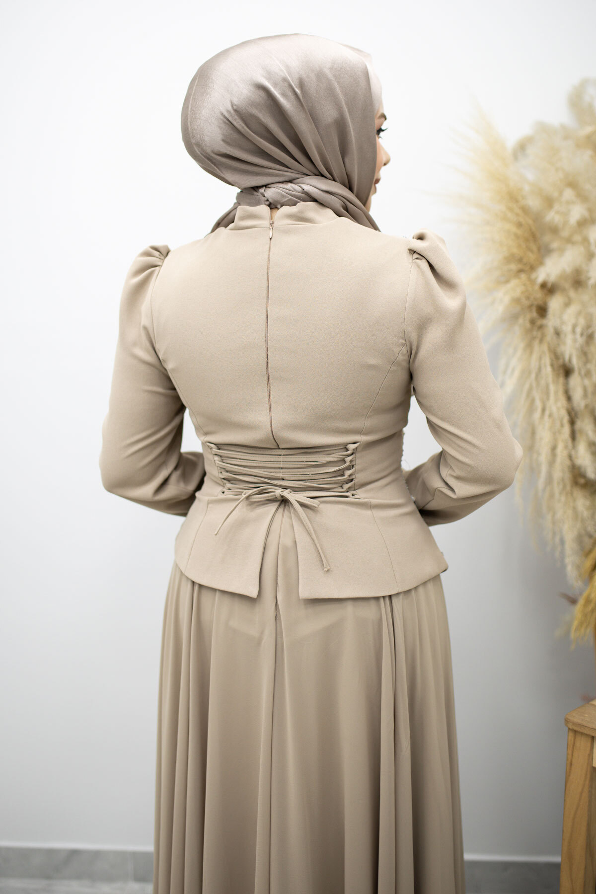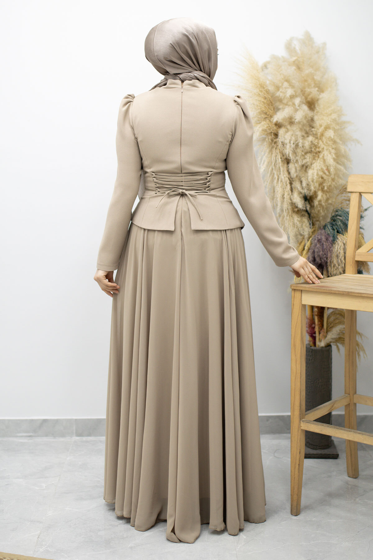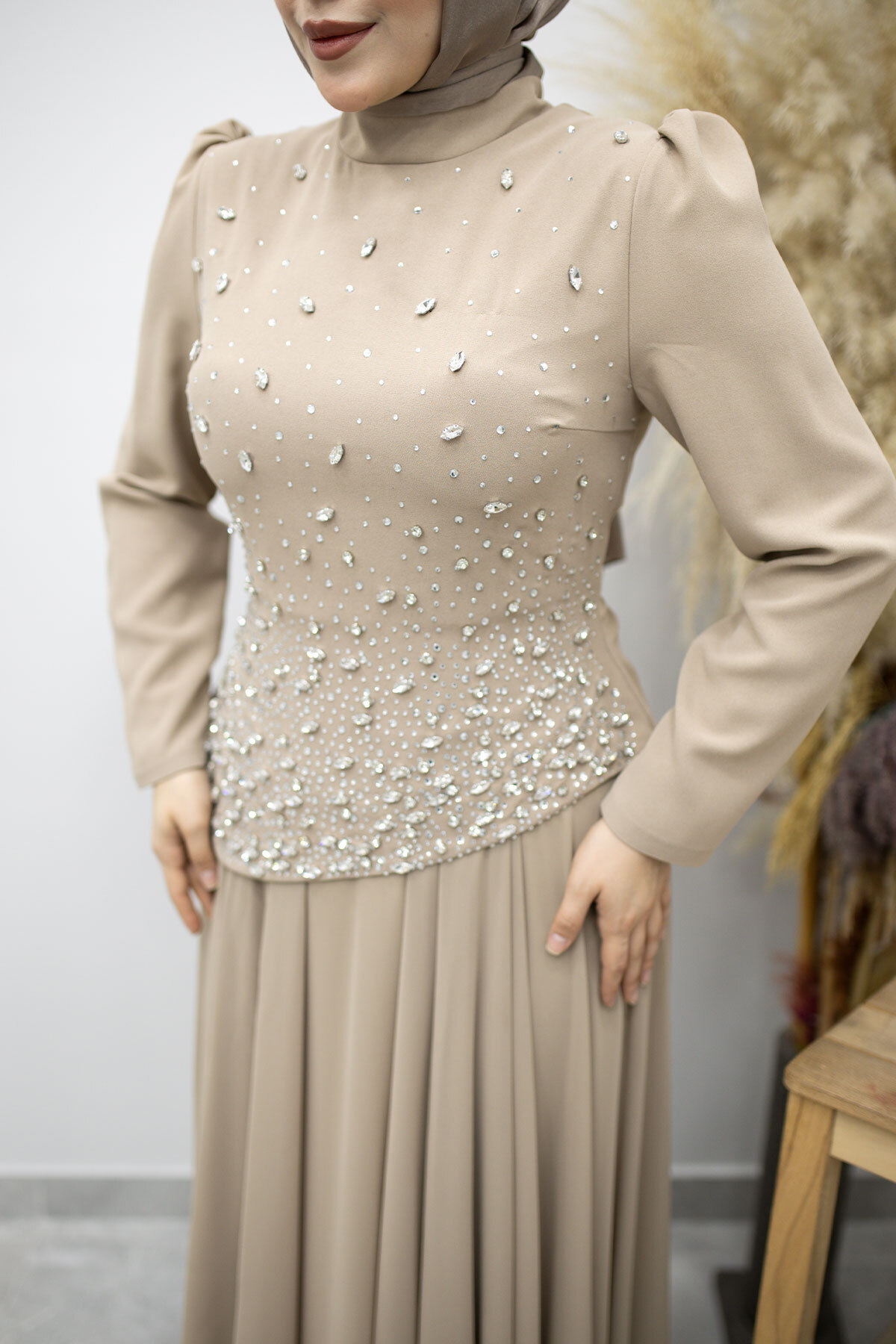 Şifon Etekli Taşlı Tesettür Abiye TSD260199 Vizon