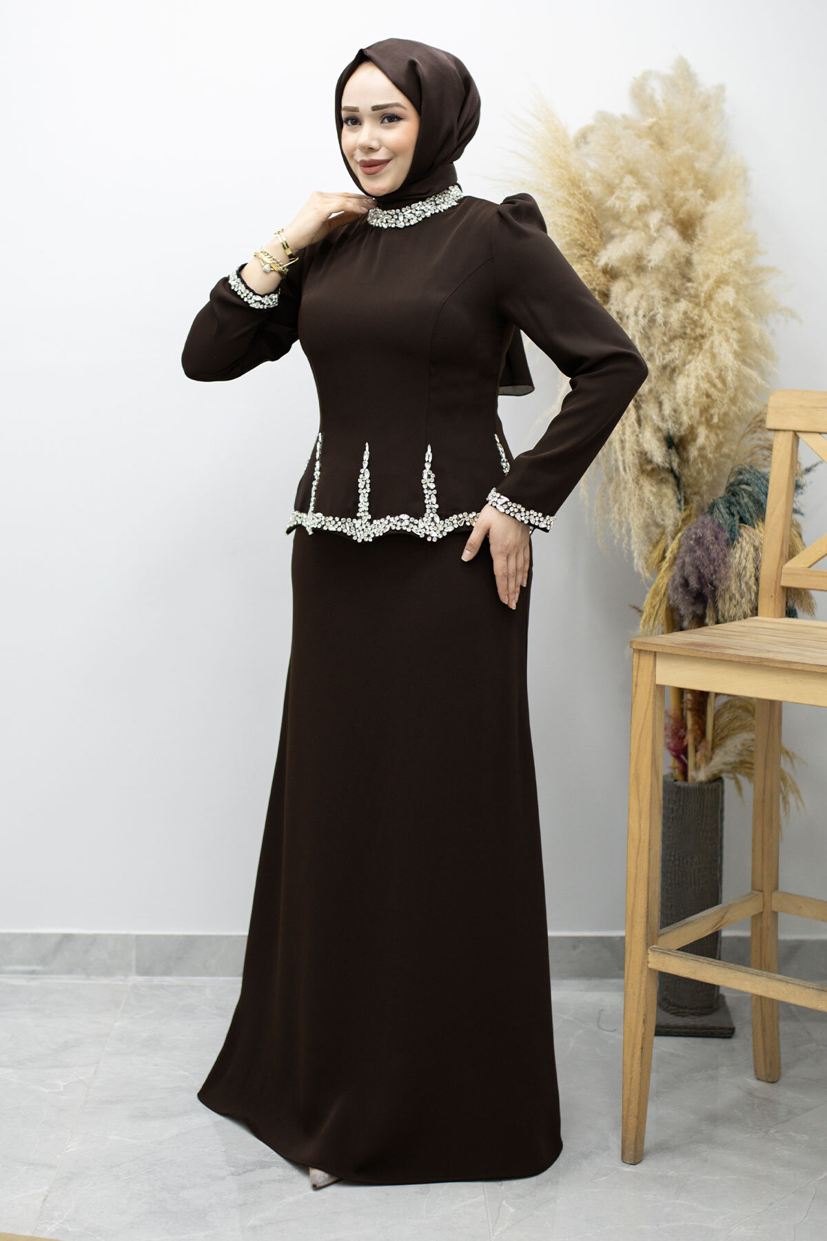 Taş İşlemeli Peplum Abiye TSD260195 Kahverengi Özellikleri