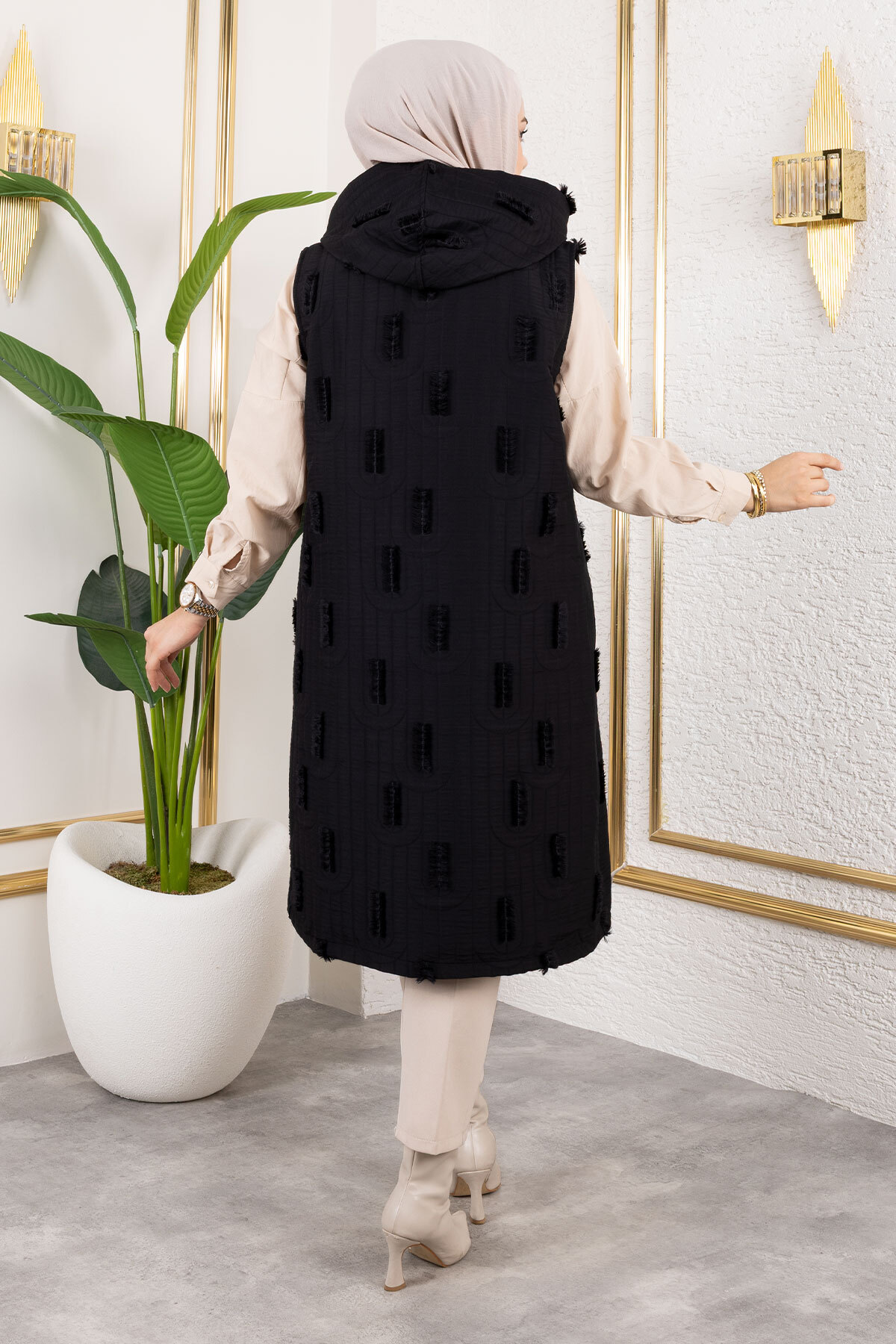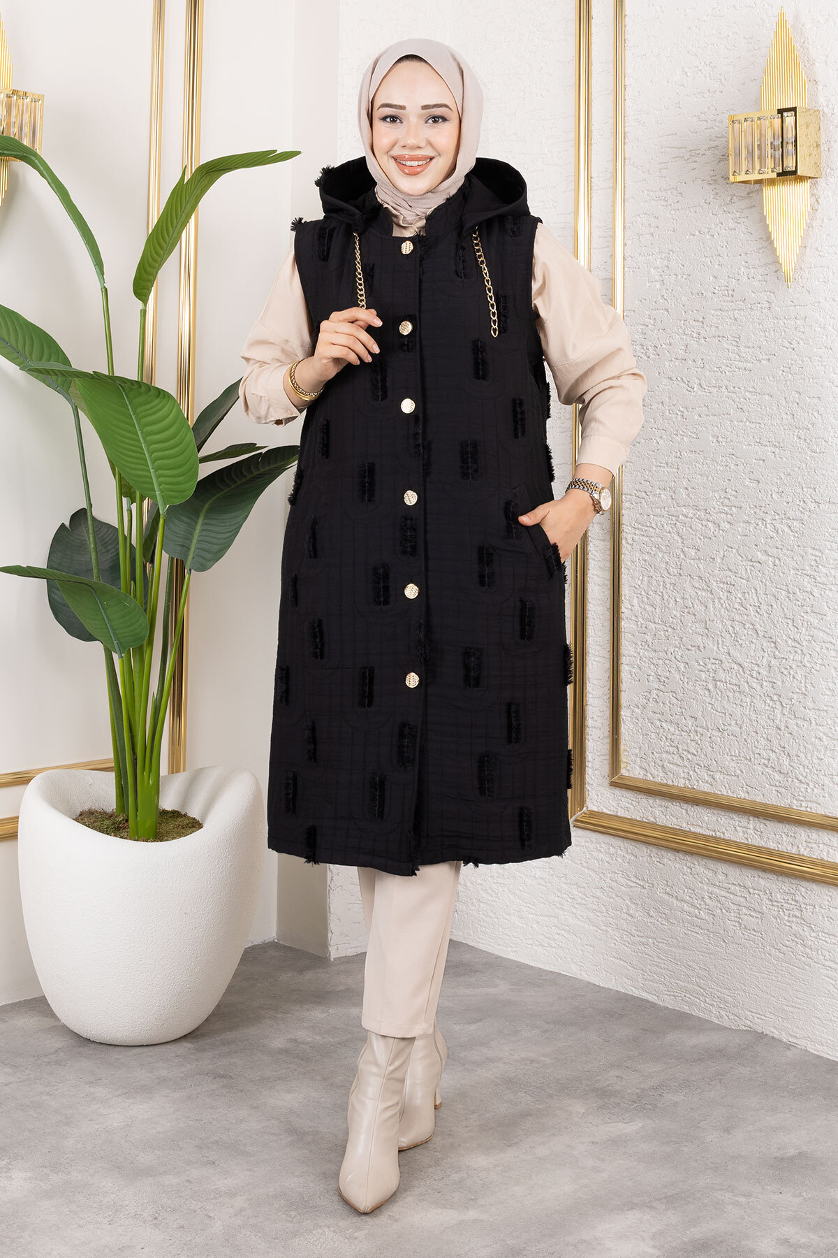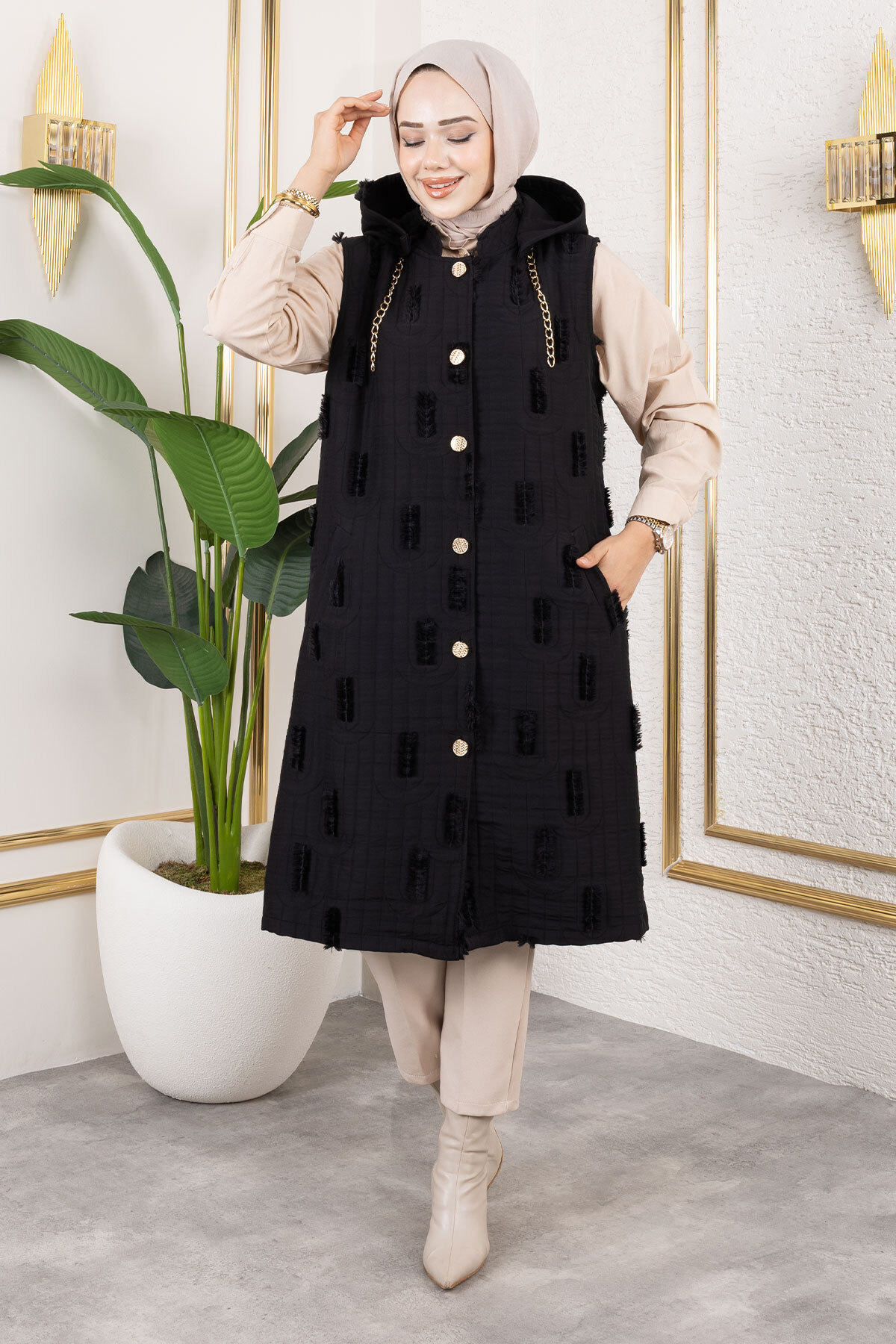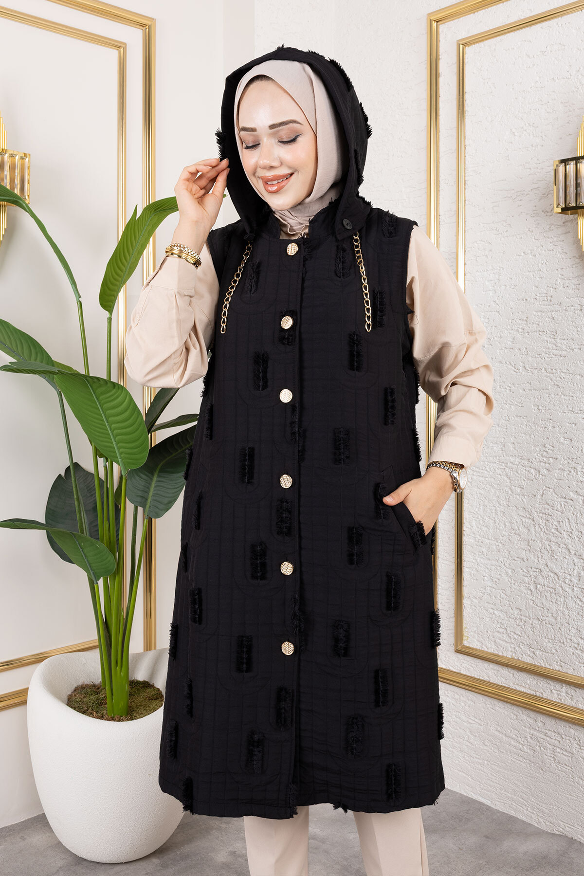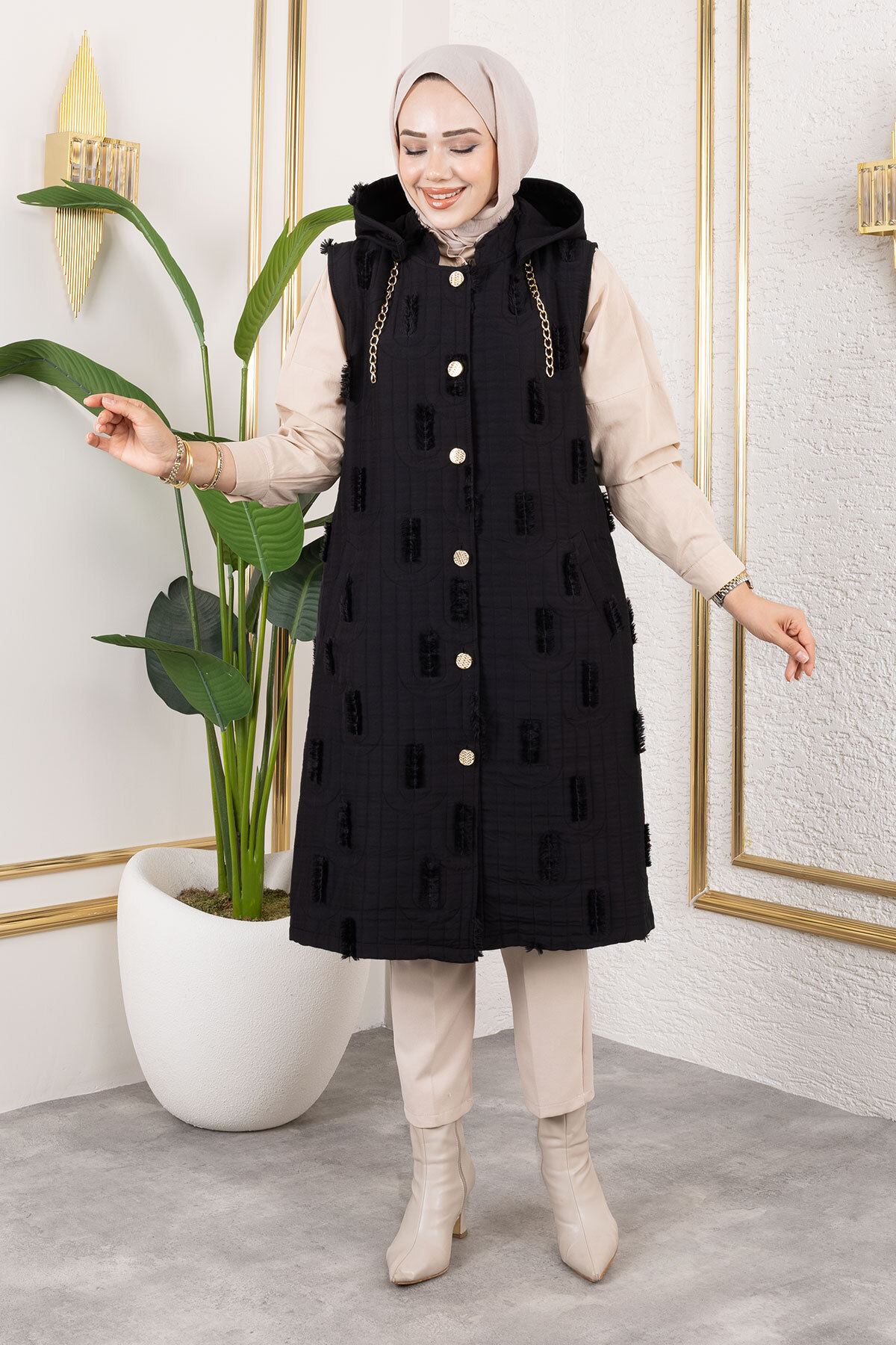 Ürün Özelliği: Yeni sezon Tüy Detaylı Kapitone Yelek modelidir. Kapüşonu mevcuttur. Kullanılabilir iki adet cebi bulunmaktadır. Astarsızdır. Önden düğmelidir. Ürün renginde konsept çekimlerinden dolayı ton farklılığı olabilir.