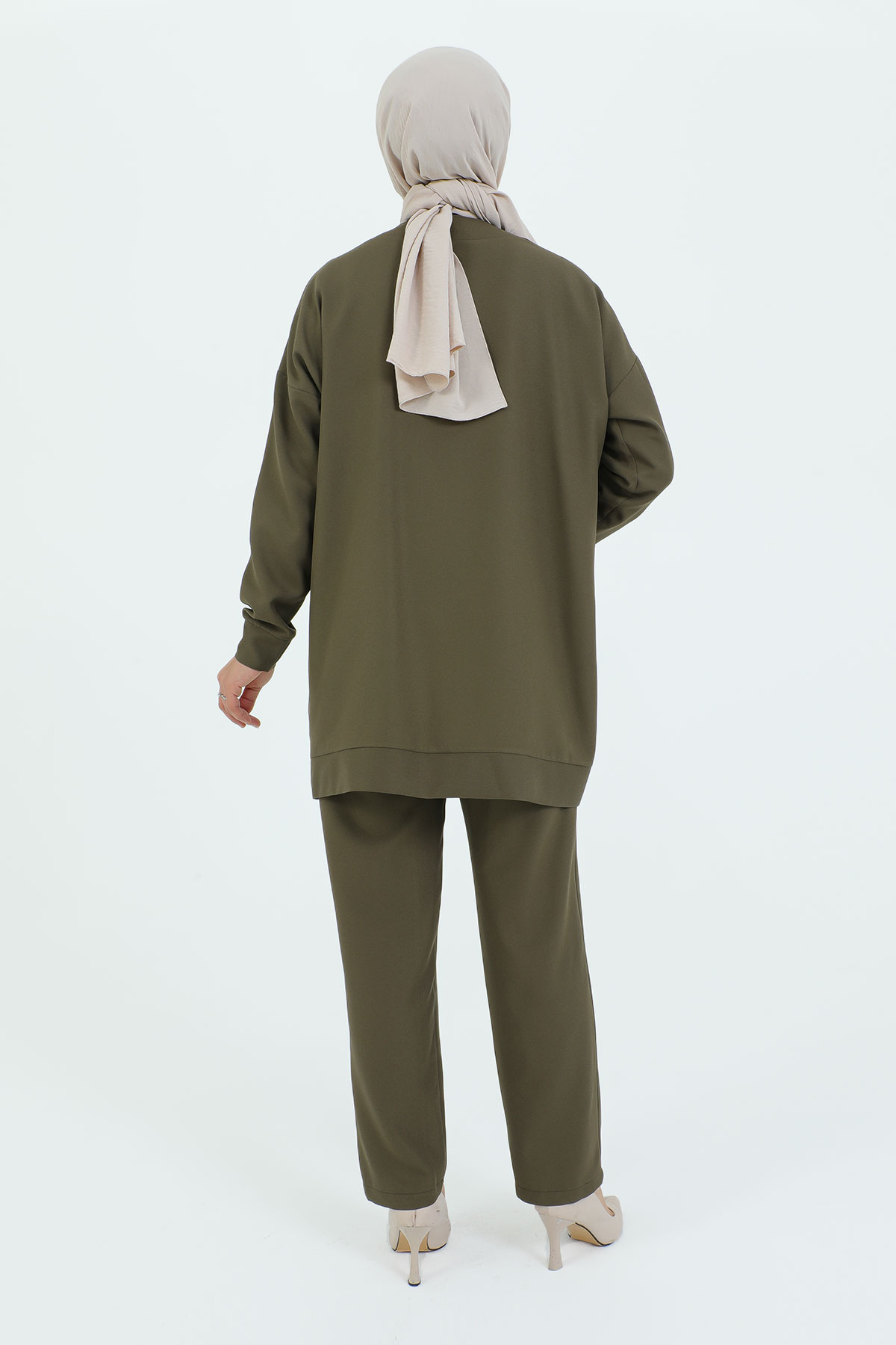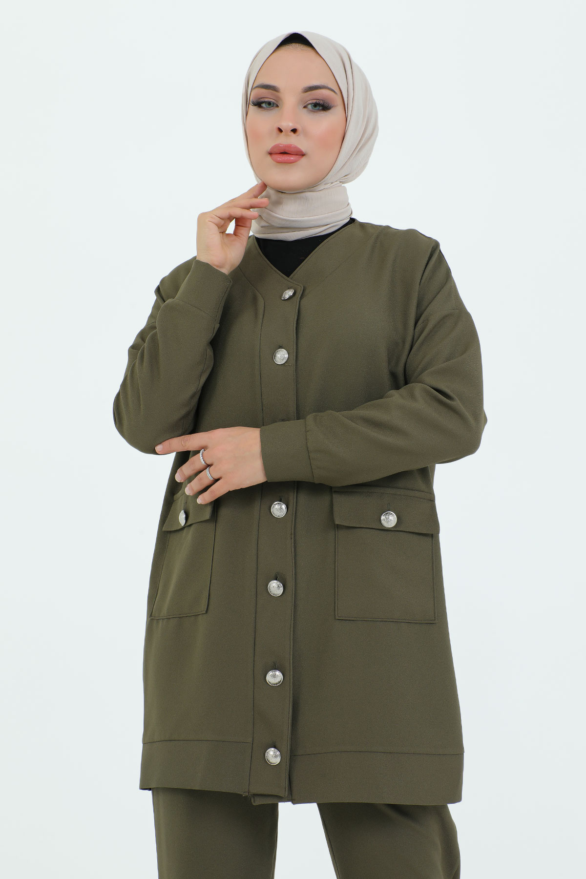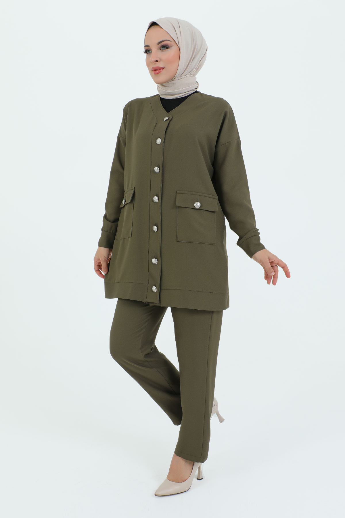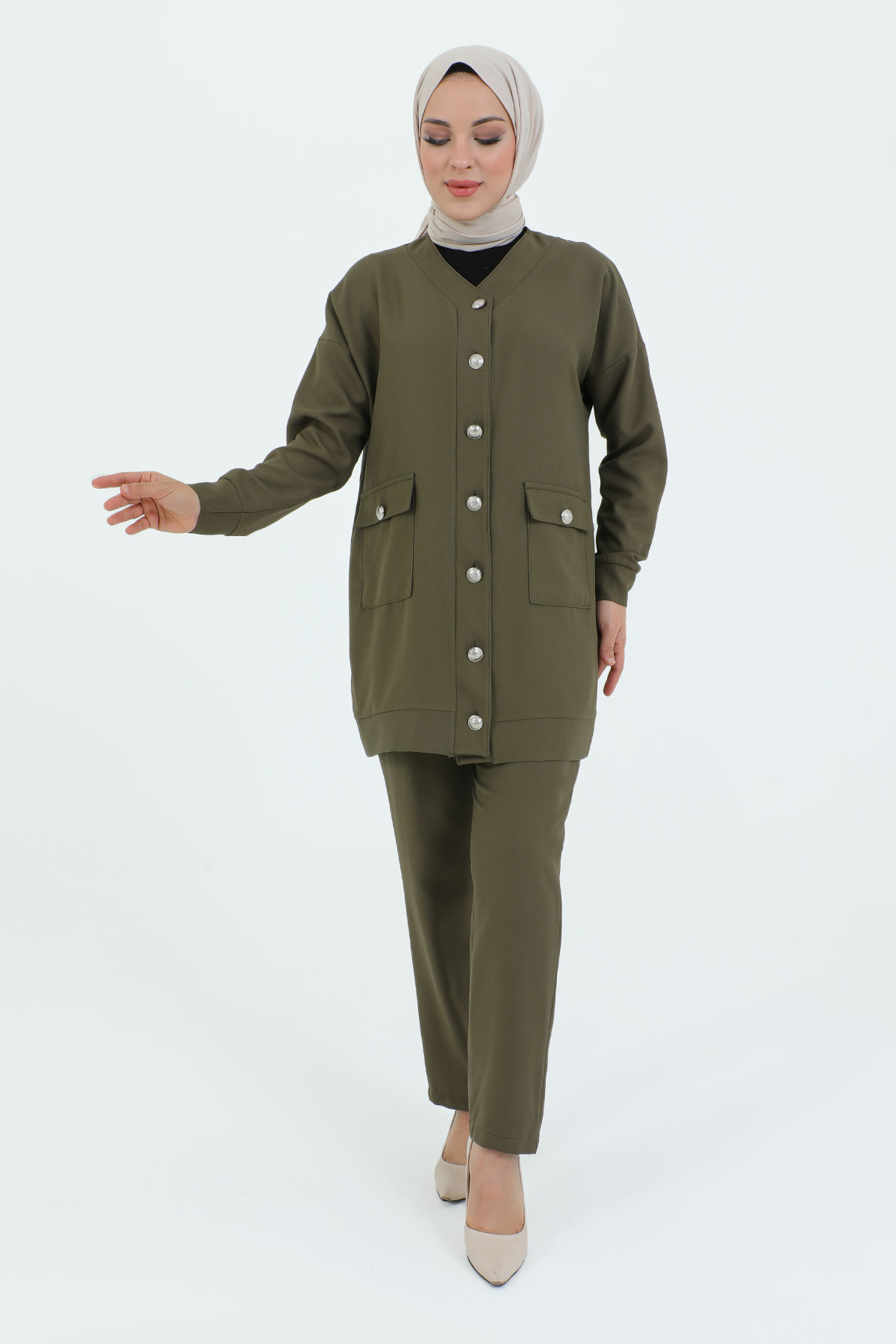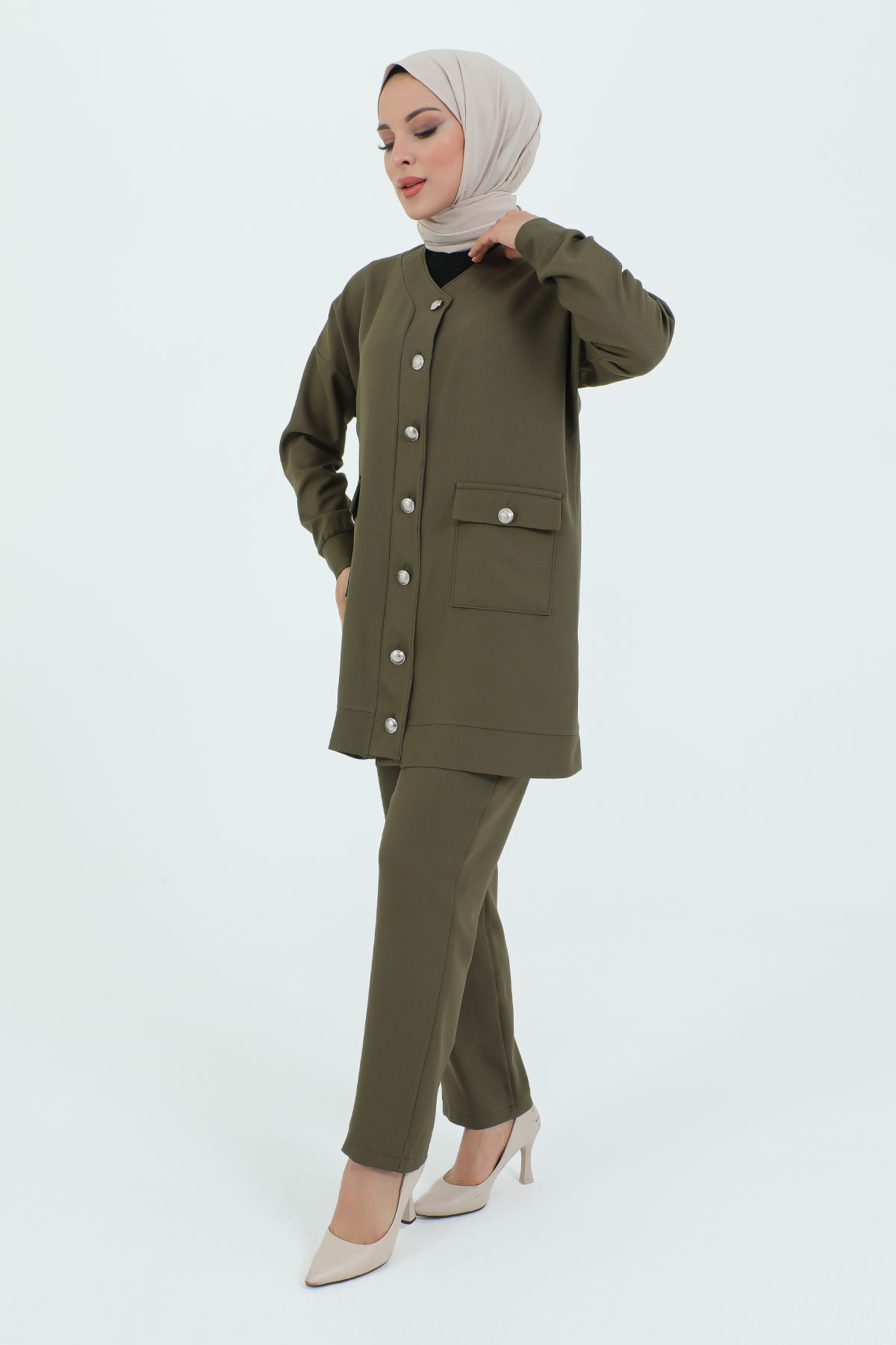 V Yaka Boydan Düğmeli Cepli İkili Takım TSD231218 Haki Özellikleri