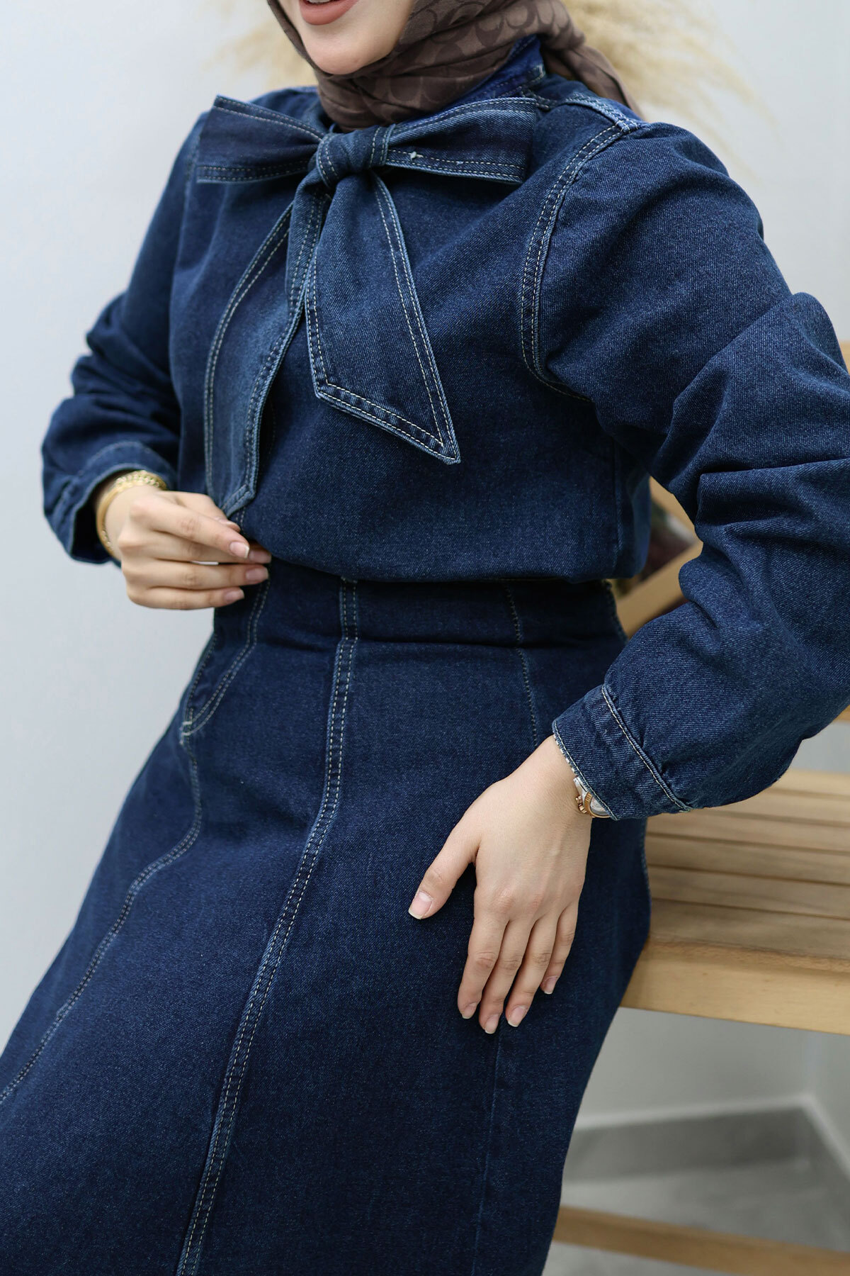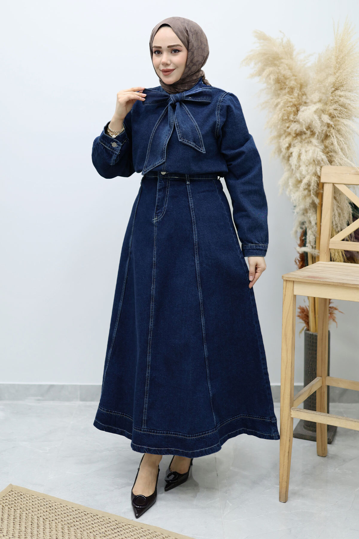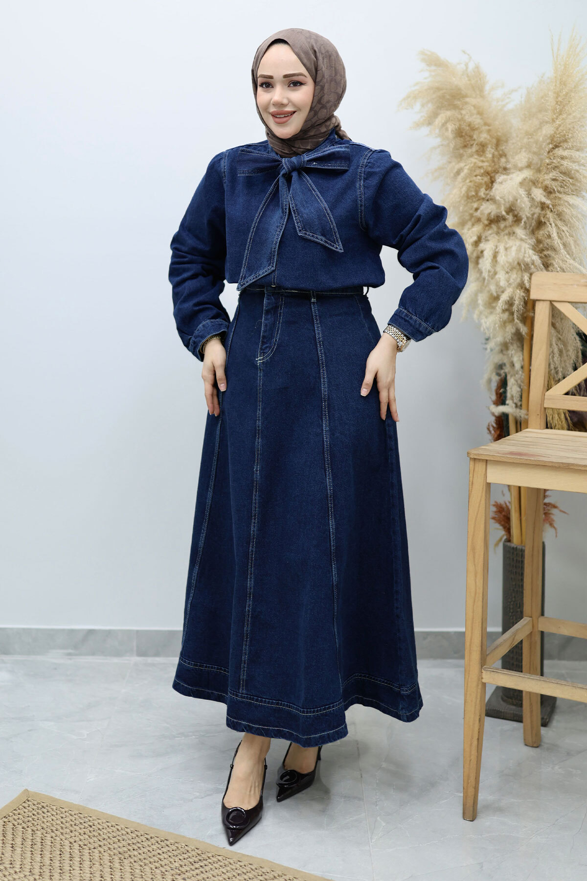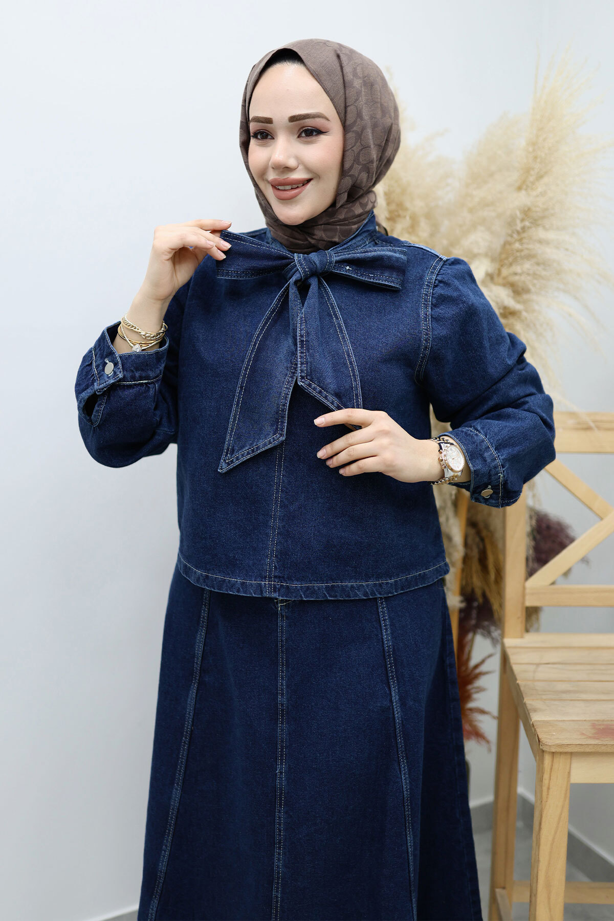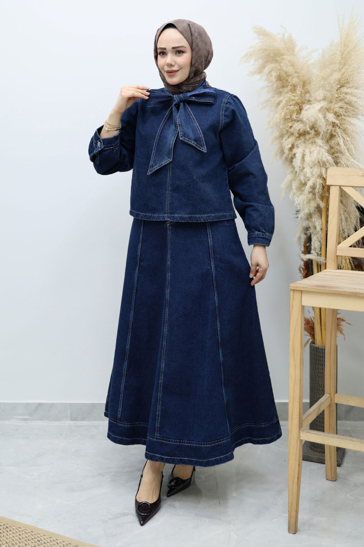 Ürün Özelliği : Yeni sezon Yakası Bağlamalı Etekli Kot Takım modelidir.