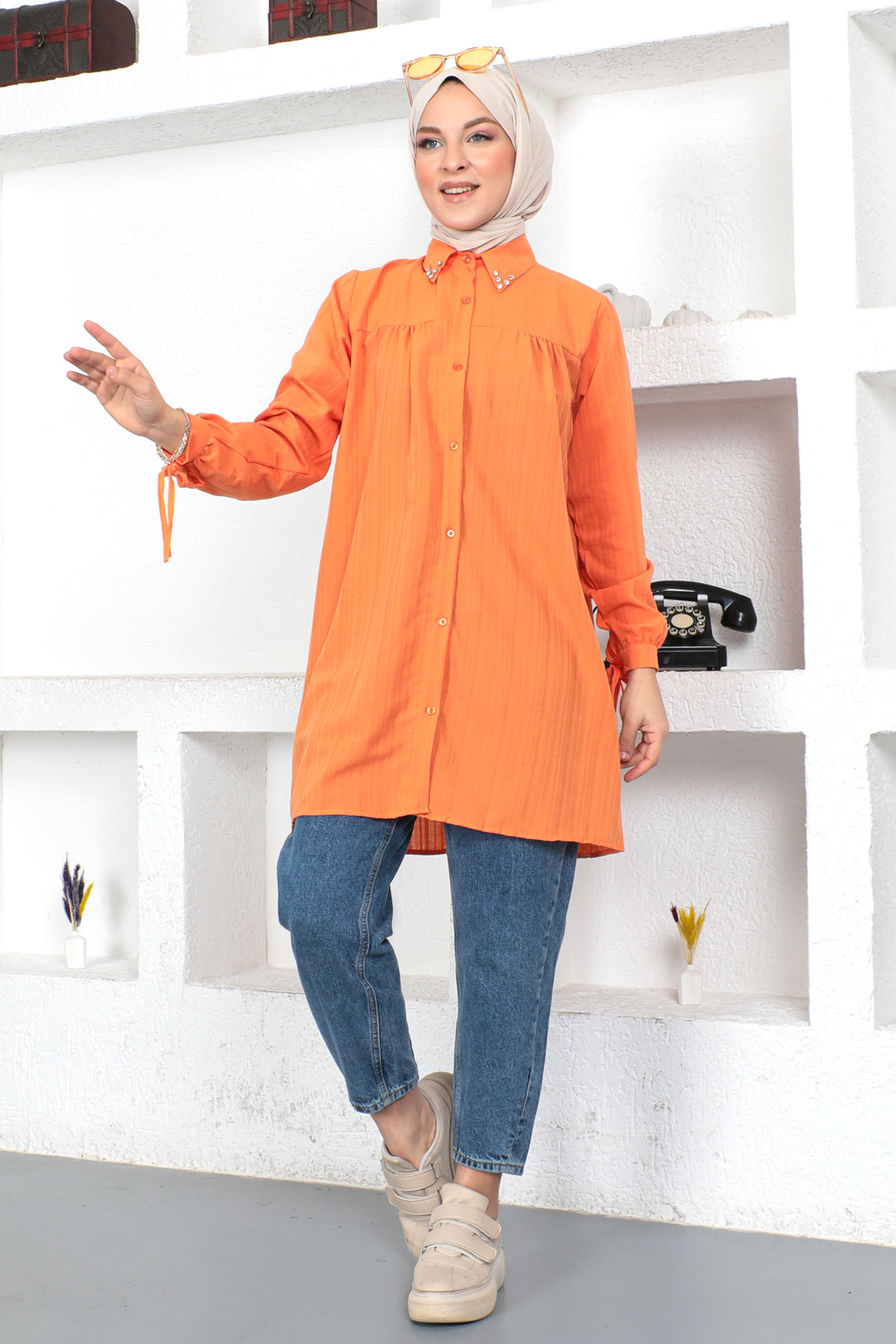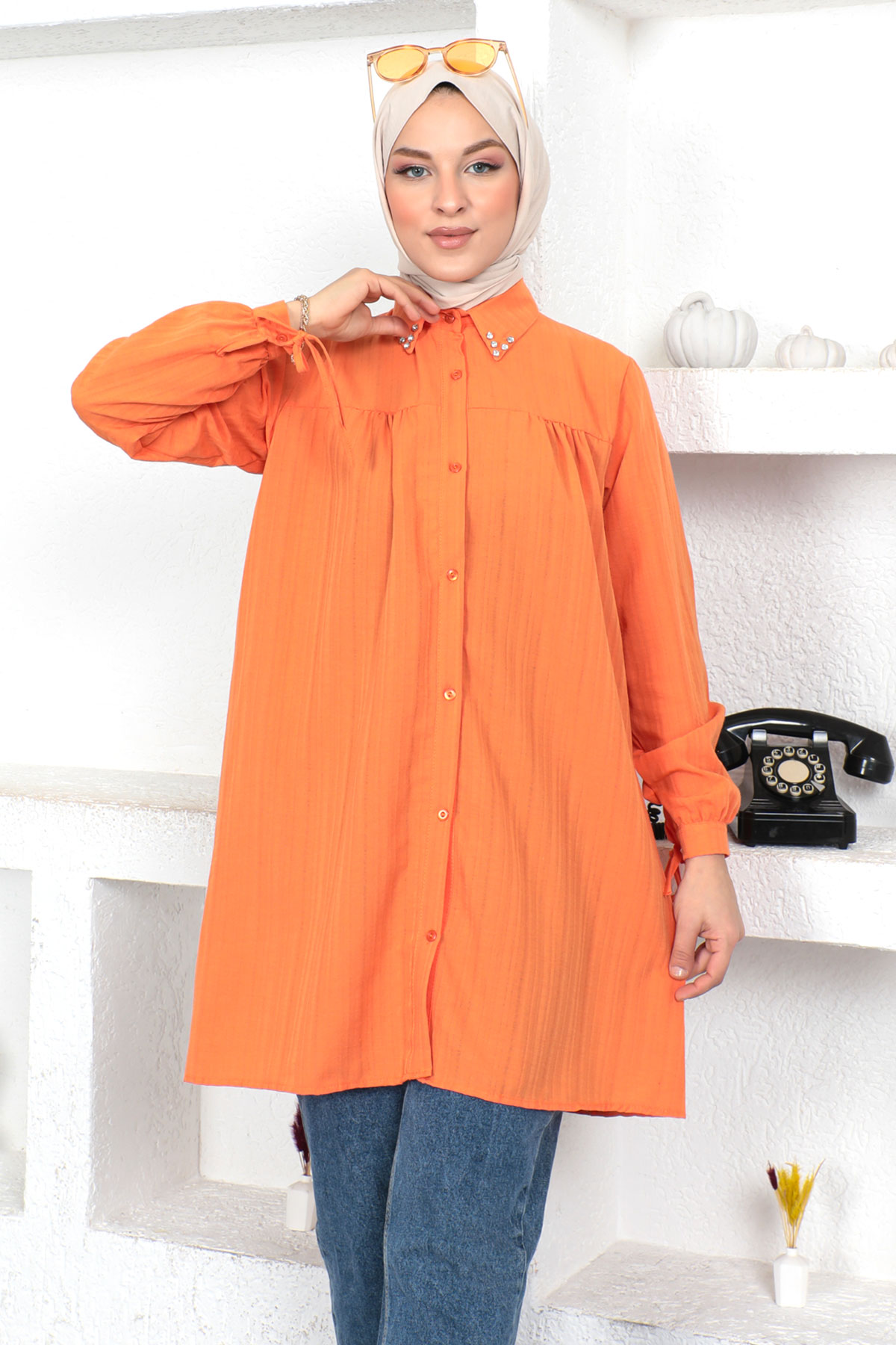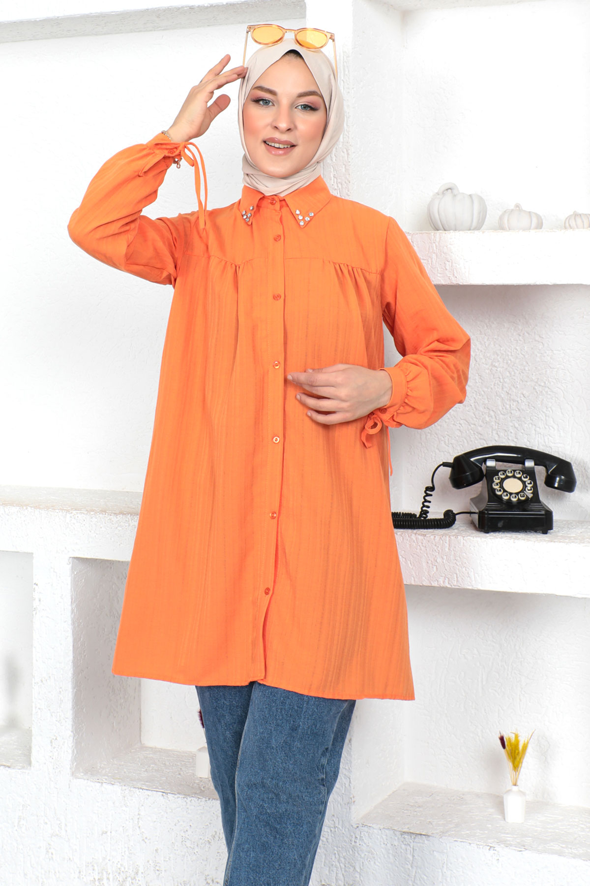 Ürün Özelliği : Yeni sezon Yakası Taş Detaylı Tunik modelidir. Kol ucu ipli bağlama detaylıdır. Önden açılır düğmelidir. Yakası gömlek yakadır ve taş detayları vardır. Göğüs kısmı ribanalıdır. Ürün renginde konsept çekimlerinden dolayı ton farklılığı olabilir.