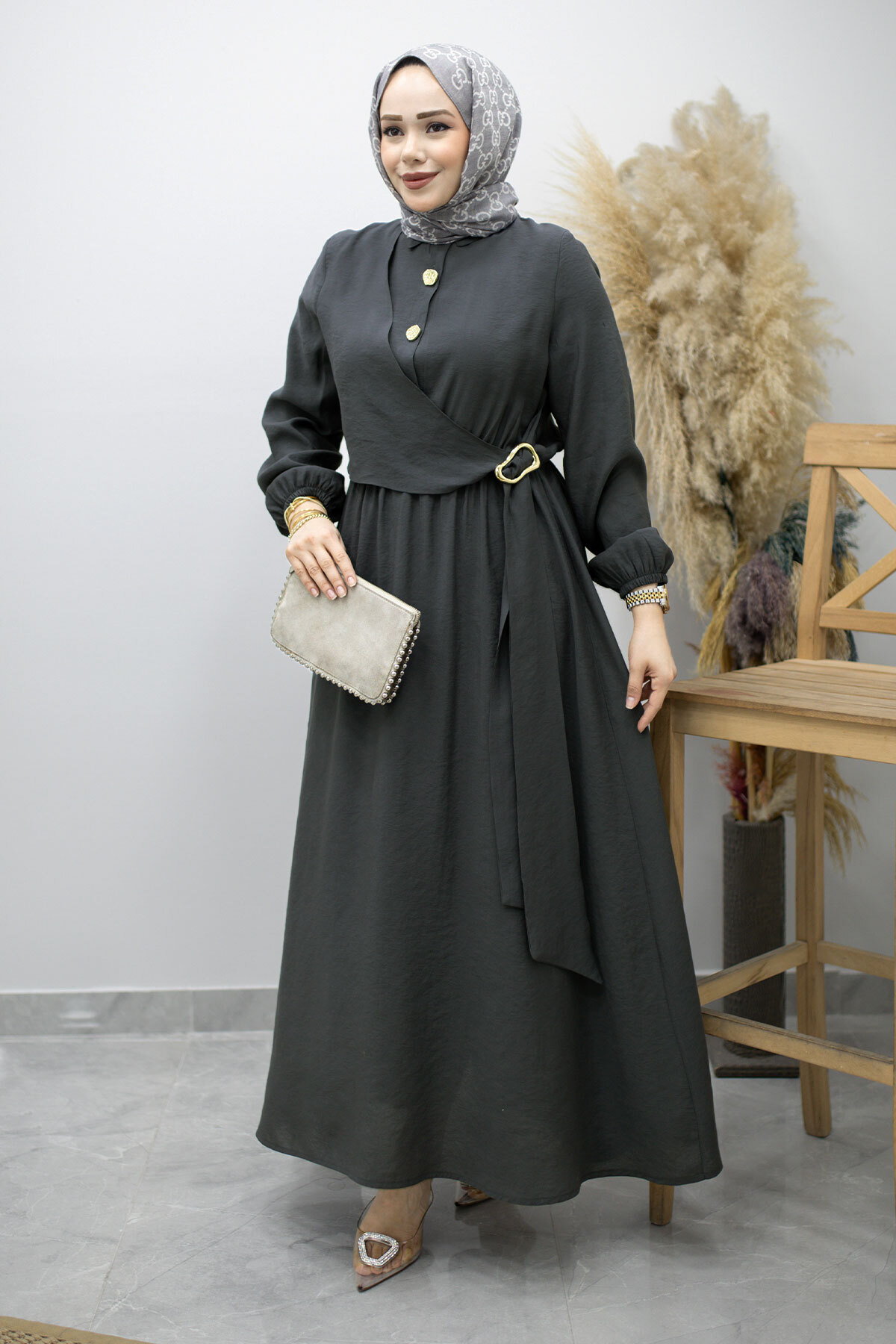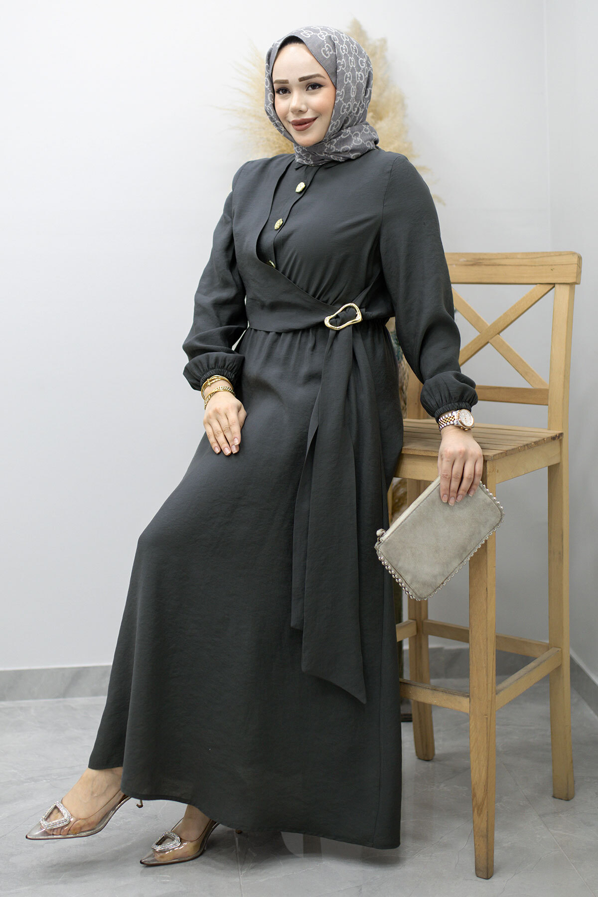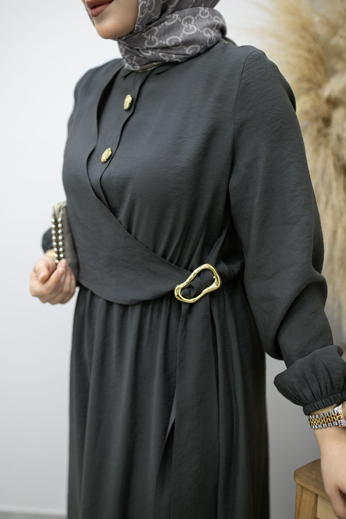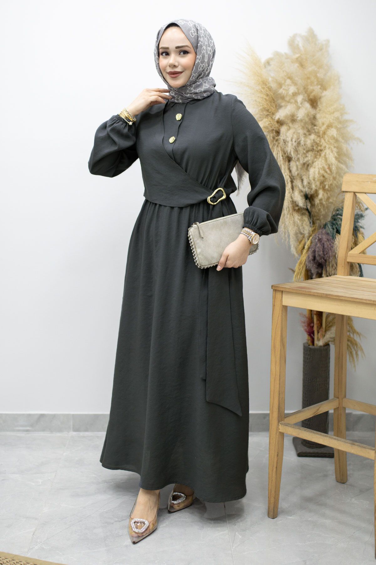 Yan Bağlamalı Toka Detaylı Elbise TSD260203 Füme Özellikleri