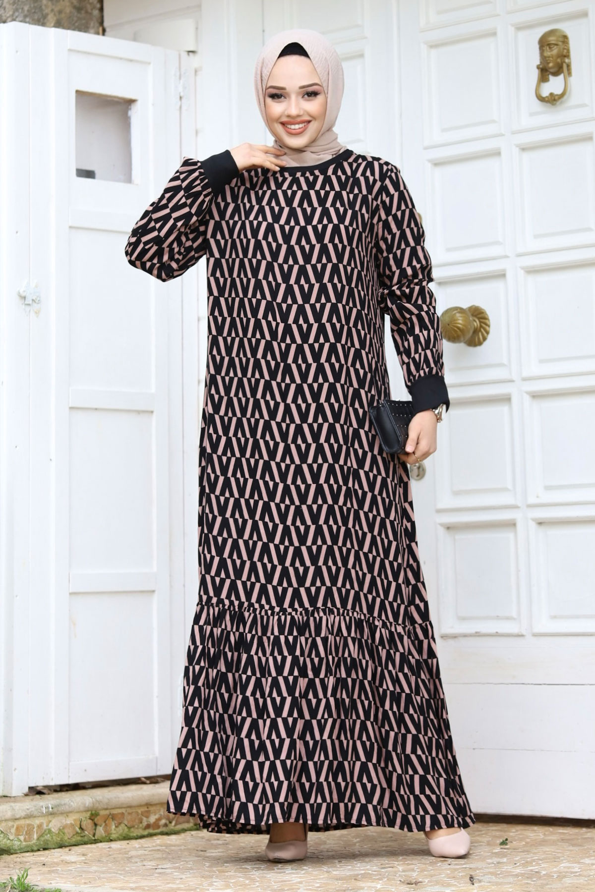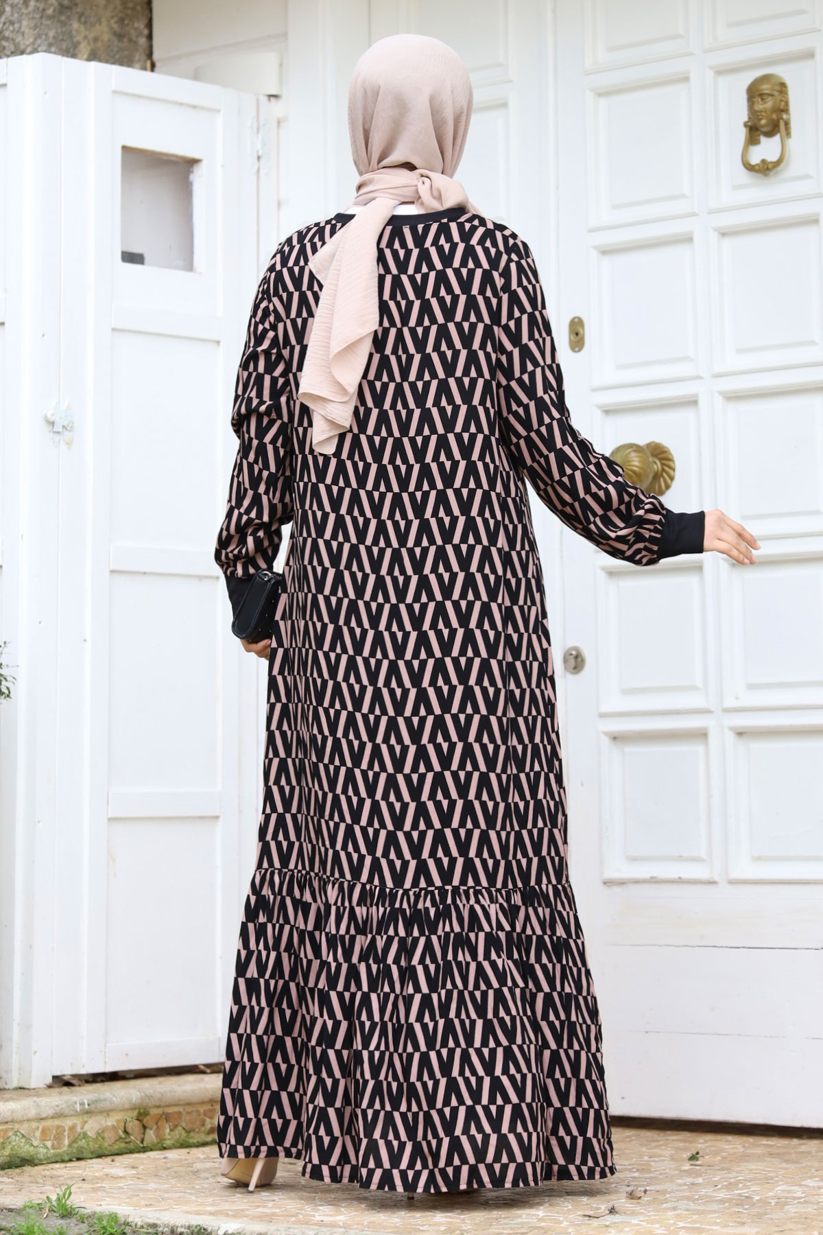 Zikzak Desenli Eteği Volanlı Elbise TSD240237 Vizon